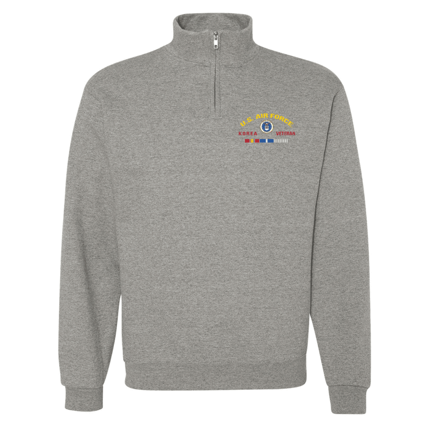 This U.S. Air Force Korea Veteran Quarter-Zip makes an excellent addition to your wardrobe or a fine gift and features High stitch density Nublend® pill-resistant fleece, Pre-shrunk 50/50 cotton/polyester and a Concealed 7"" zipper. The graphic is state of the art DTF film.It is available in 3 colors - Black, Navy Blue and Oxford Gray.