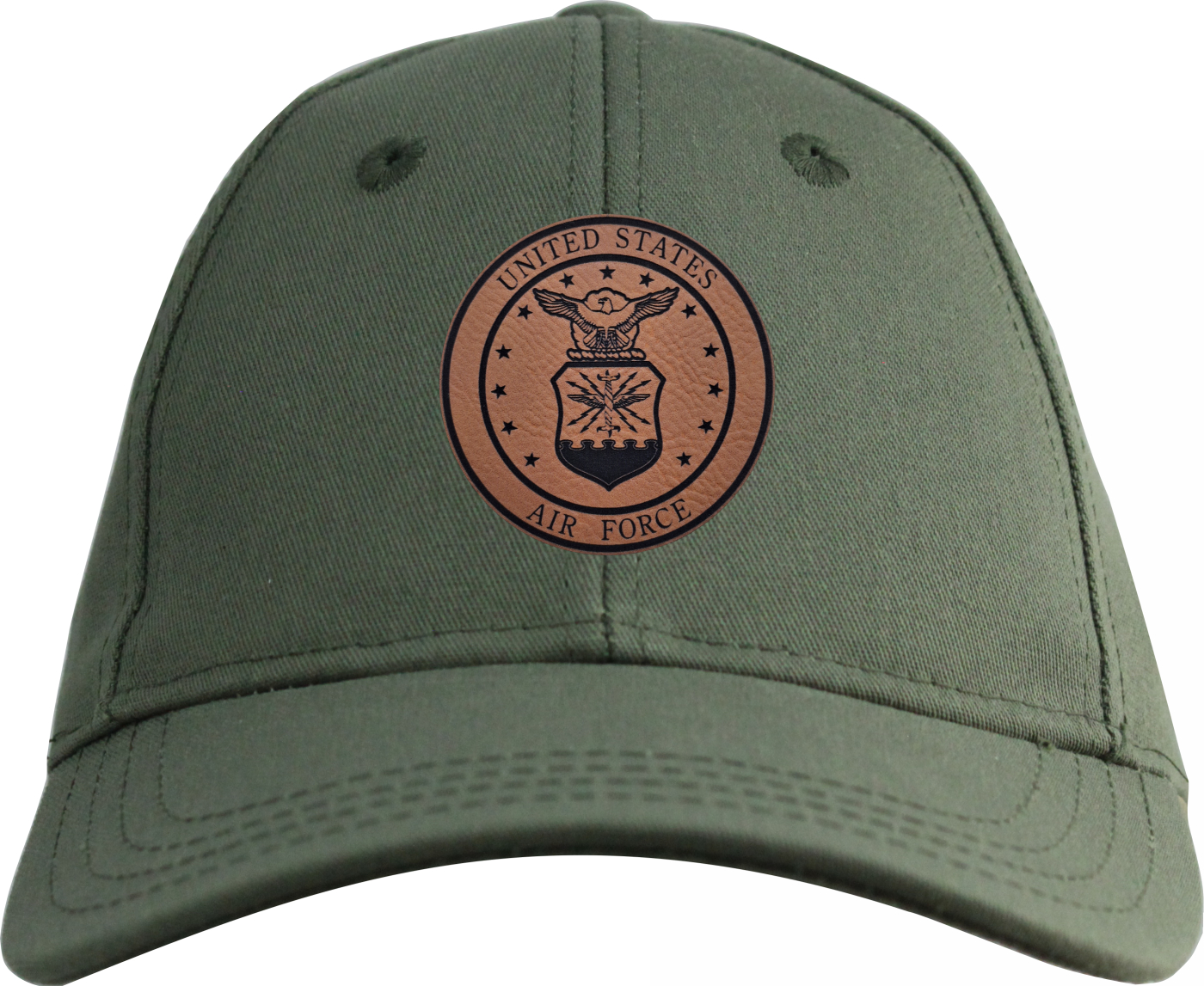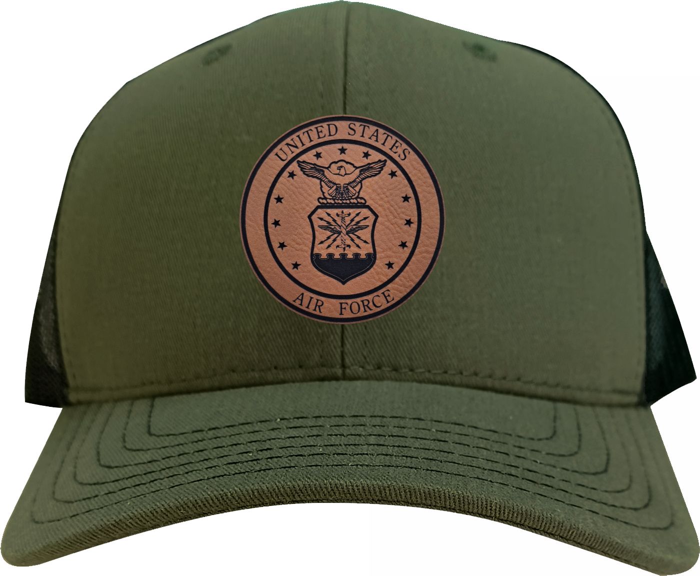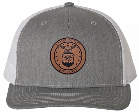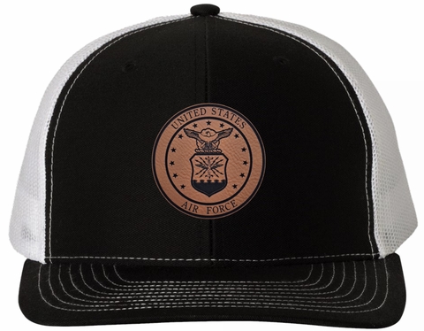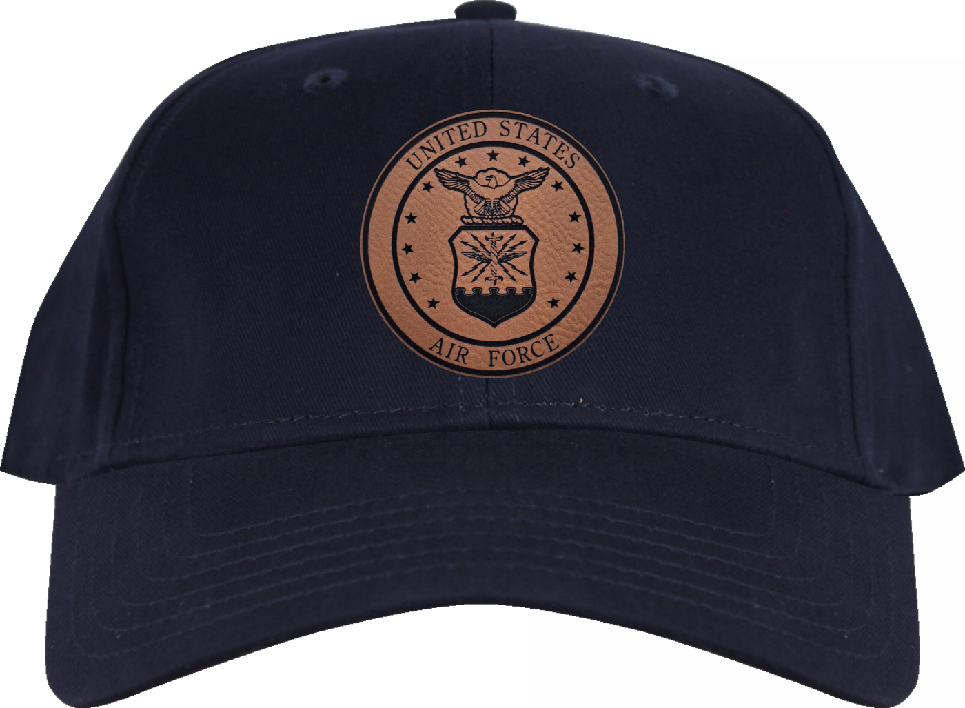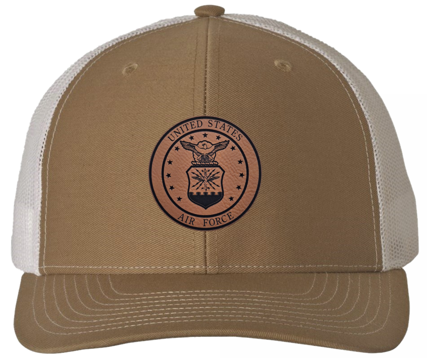 We are proud to offer this U.S. Air Force Emblem Leather Patch Cap. These caps are 100% Made in the USA! Each leather patch is applied to a 6 Panel - Mid Profile cap. All of our 2-tone colored caps are made with a white mesh backing, except for OD Green which has a black mesh backing.Caps ordered with custom embroidered personalized back text require an additional 2 to 3 days production time. All custom back text will be embroidered in ALL CAPITAL LETTERS. Caps personalized with back text are non-returnable unless there is a material defect in the cap.