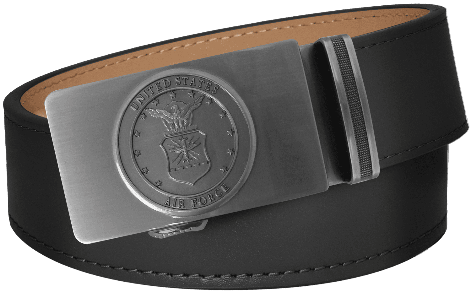 MilitaryBest has partnered with PA Belts to offer this officially Licensed U.S. Air Force Black Full Grain Leather Slide Belt. This wonderfully detailed U.S. Air Force Seal belt and buckle is a perfect way to show your pride or to give as a gift to a deserving veteran or active duty service member. This belt and fine Air Force Buckle comes in a beautiful 4mm square or round acrylic box with the Official U.S. Air Force hologram as your proof of authenticity. One size fits all, simply cut the belt to fit. No more annoying holes, simply slide the belt, listen to the clicks and enhance your fashion. Easy to put on, to wear and to take off. Instructions included.