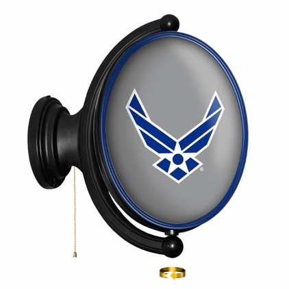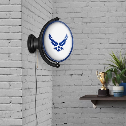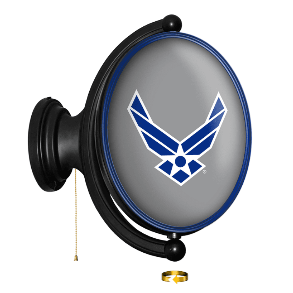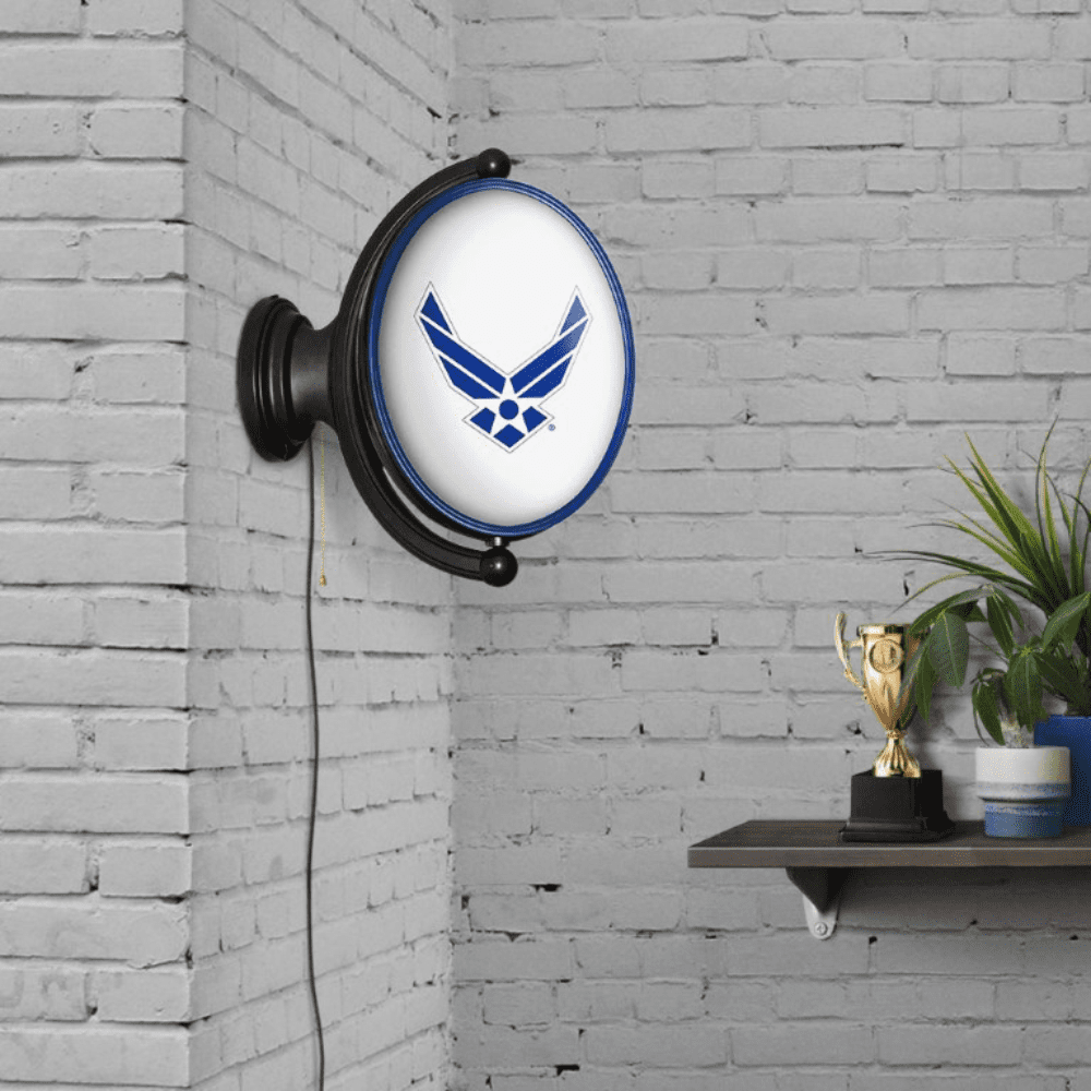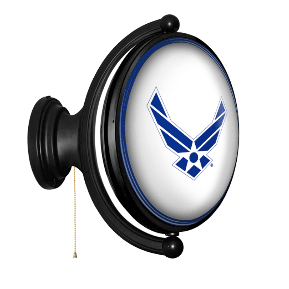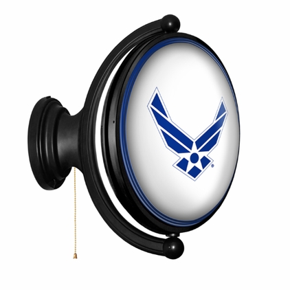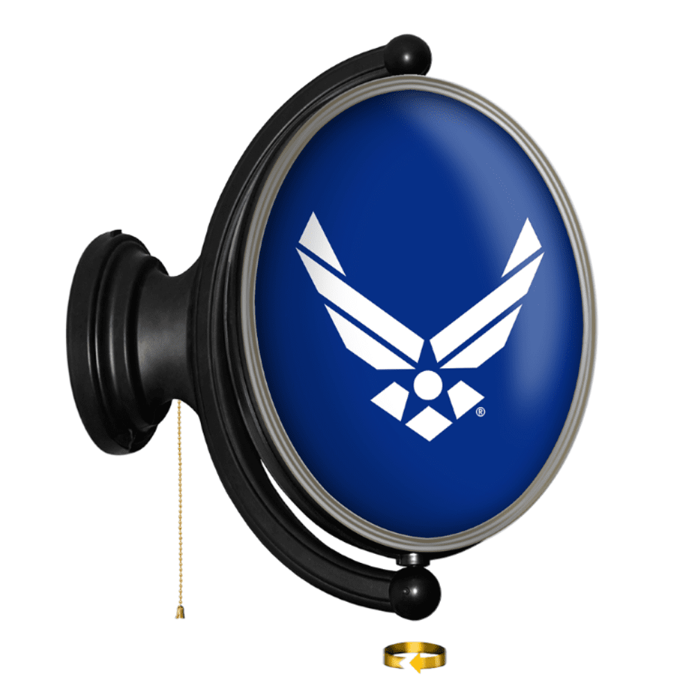 The Original United States Air Force Rotating Lighted Wall Sign both lights up and spins while allowing you to display your dedication to the USAF. Whether it's your fan cave, office, game room, or garage, this decorative sign is the perfect addition to any wall. It showcases the latest in LED technology and only uses 12 watts of power. Injection molded, it comes with an 8ft. power cord and a metal pull chain. Mounting hardware included and installation takes no more than 10 minutes. This is an officially licensed product of the US Air Force and made in the USA.FEATURES