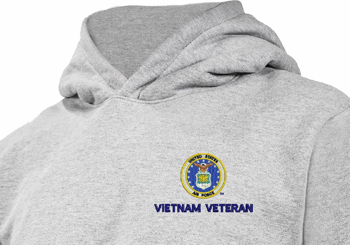 Striving to provide you with the highest quality apparel made in the United States, MilitaryBest is proud to offer this U.S. Air Force Seal Vietnam Veteran Heavy Weight Fleece Hoodie. Manufactured by WSI Sportswear in Minnesota and Embroidered by us here at MilitaryBest in Alabama; this fleece hoodie is 100% Made in the USA! We aim to provide you with soft, comfortable, dry-fit, American-made clothing that allows you to be your best.*For washing we recommend machine wash cold with like colors, and line dry.PRODUCT FEATURES