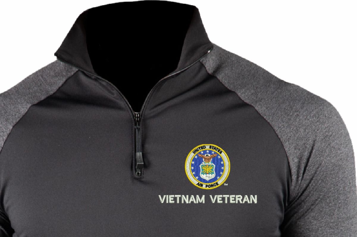 Striving to provide you with the highest quality apparel made in the United States, MilitaryBest is proud to offer this U.S. Air Force Seal Vietnam Veteran ProWikMax 2-Tone 1/4 Zip Knit Long Sleeve Shirt. Manufactured by WSI Sportswear in Minnesota and Embroidered by us here at MilitaryBest in Alabama; this shirt is 100% Made in the USA! We aim to provide you with soft, comfortable, dry-fit, American-made clothing that allows you to be your best. ProWikMax is 92% Polyester, 8% Spandex, and made to be both durable and flattering.*For washing we recommend machine wash cold with like colors, and line dry.PRODUCT FEATURES