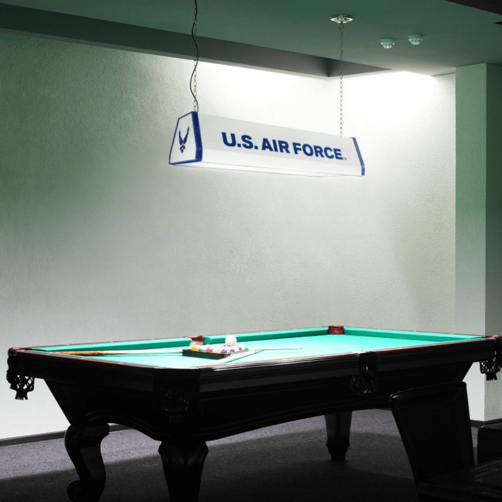 Our United States Air Force standard pool table light is the perfect way to put that finishing touch on any fan cave or billiard room while showing your pride for the USAF. Injection molded and features a high-resolution image with a high gloss finish and metallic trim. Hanging hardware included. This is an officially licensed product of the US Air Force and made in the USA.FEATURES