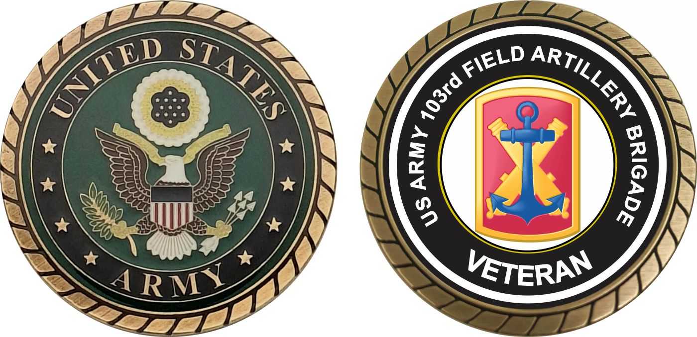 This 1 3/4” U.S. Army 103rd Field Artillery Brigade Veteran Challenge Coin is proudly offered by MilitaryBest. This Officially Licensed Army coin has beautiful enamel finish on one side and an organized crisp clean U.S. Army 103rd Field Artillery Brigade Veteran design on the opposite side.
