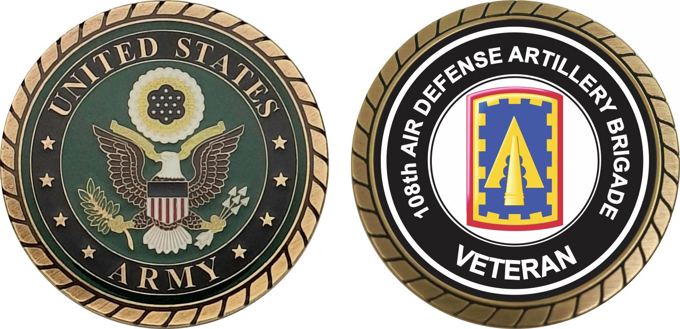 This 1 3/4” U.S. Army 108th Air Defense Artillery Brigade Veteran Challenge Coin is proudly offered by MilitaryBest. This Officially Licensed Army coin has beautiful enamel finish on one side and an organized crisp clean U.S. Army 108th Air Defense Artillery Brigade Veteran design on the opposite side.