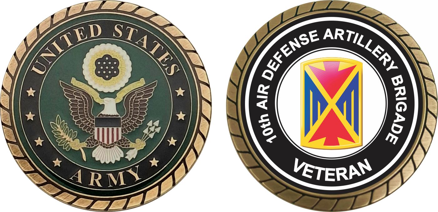This 1 3/4” U.S. Army 10th Air Defense Artillery Brigade Veteran Challenge Coin is proudly offered by MilitaryBest. This Officially Licensed Army coin has beautiful enamel finish on one side and an organized crisp clean U.S. Army 10th Air Defense Artillery Brigade Veteran design on the opposite side.