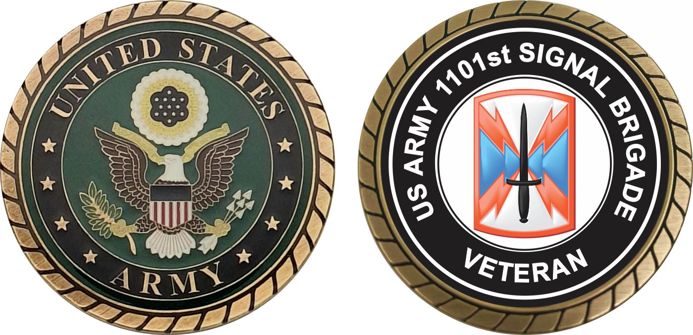 This 1 3/4” U.S. Army 1101st Signal Brigade Veteran Challenge Coin is proudly offered by MilitaryBest. This Officially Licensed Army coin has beautiful enamel finish on one side and an organized crisp clean U.S. Army 1101st Signal Brigade Veteran design on the opposite side.