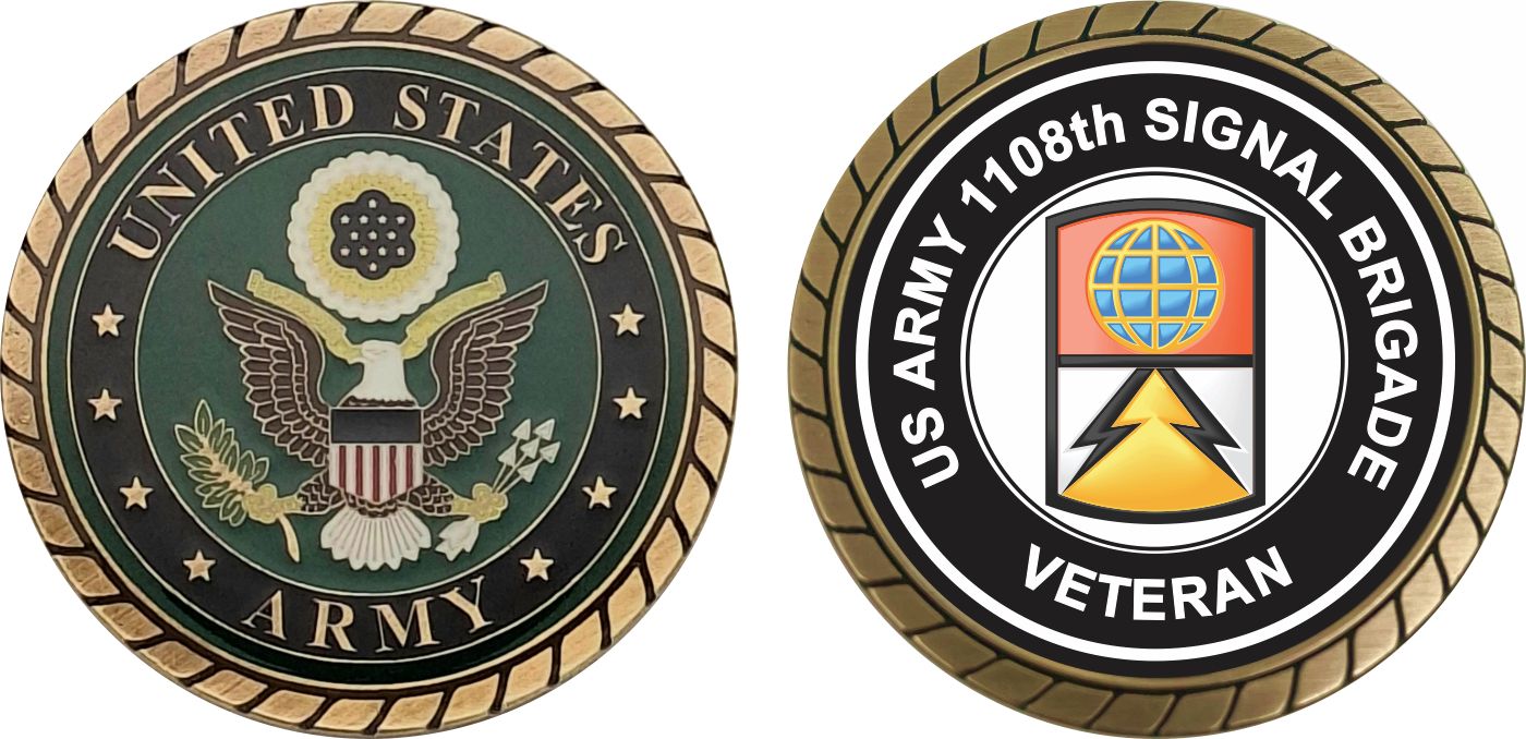 This 1 3/4” U.S. Army 1108th Signal Brigade Veteran Challenge Coin is proudly offered by MilitaryBest. This Officially Licensed Army coin has beautiful enamel finish on one side and an organized crisp clean U.S. Army 1108th Signal Brigade Veteran design on the opposite side.