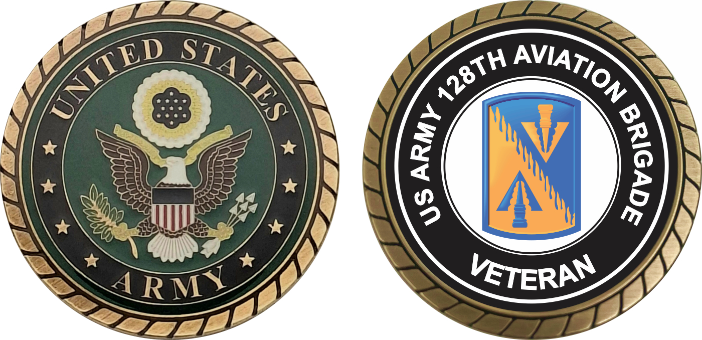This 1 3/4” U.S. Army 128th Aviation Brigade Veteran Challenge Coin is proudly offered by MilitaryBest. This Officially Licensed Army coin has beautiful enamel finish on one side and an organized crisp clean U.S. Army 128th Aviation Brigade Veteran design on the opposite side.