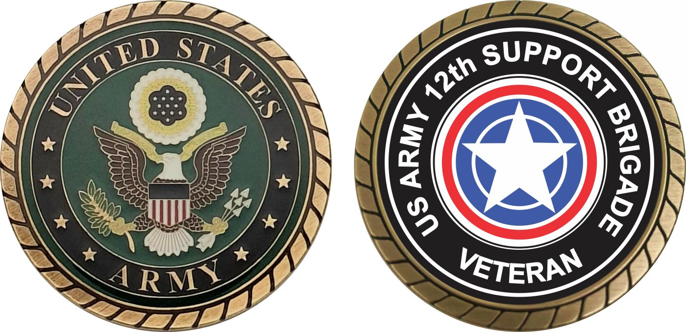 This 1 3/4” U.S. Army 12th Support Brigade Veteran Challenge Coin is proudly offered by MilitaryBest. This Officially Licensed Army coin has beautiful enamel finish on one side and an organized crisp clean U.S. Army 12th Support Brigade Veteran design on the opposite side.