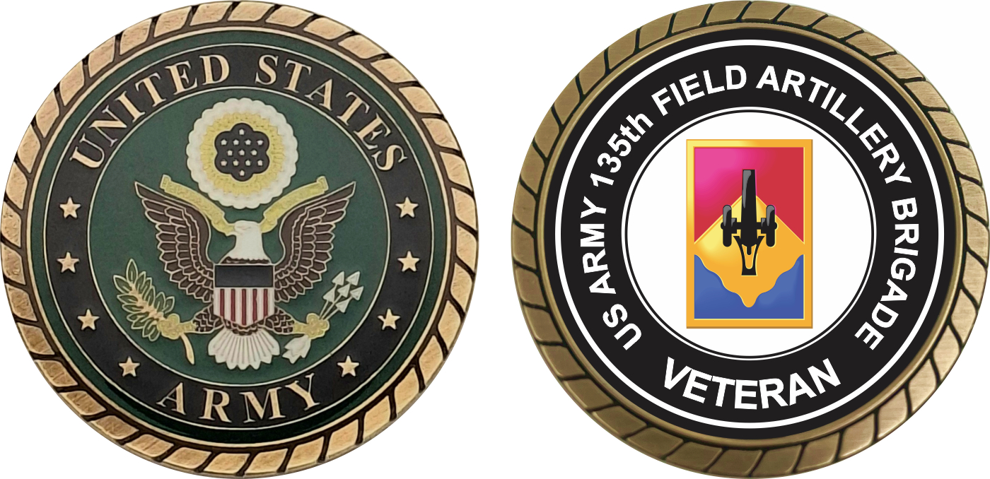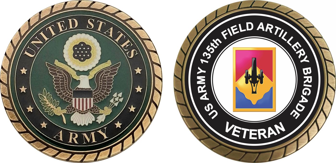 This 1 3/4” U.S. Army 135th Field Artillery Brigade Veteran Challenge Coin is proudly offered by MilitaryBest. This Officially Licensed Army coin has beautiful enamel finish on one side and an organized crisp clean U.S. Army 135th Field Artillery Brigade Veteran design on the opposite side.