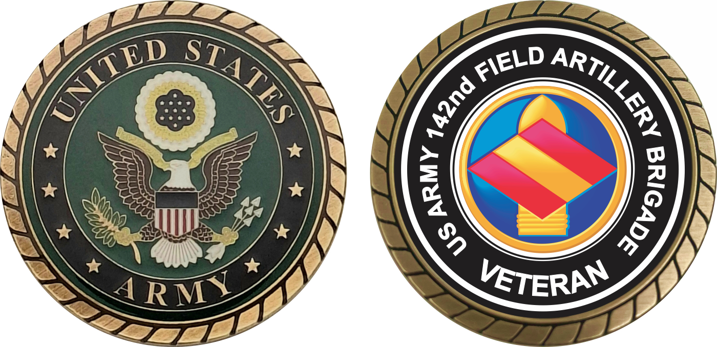 This 1 3/4” U.S. Army 142nd Field Artillery Brigade Veteran Challenge Coin is proudly offered by MilitaryBest. This Officially Licensed Army coin has beautiful enamel finish on one side and an organized crisp clean U.S. Army 142nd Field Artillery Brigade Veteran design on the opposite side.