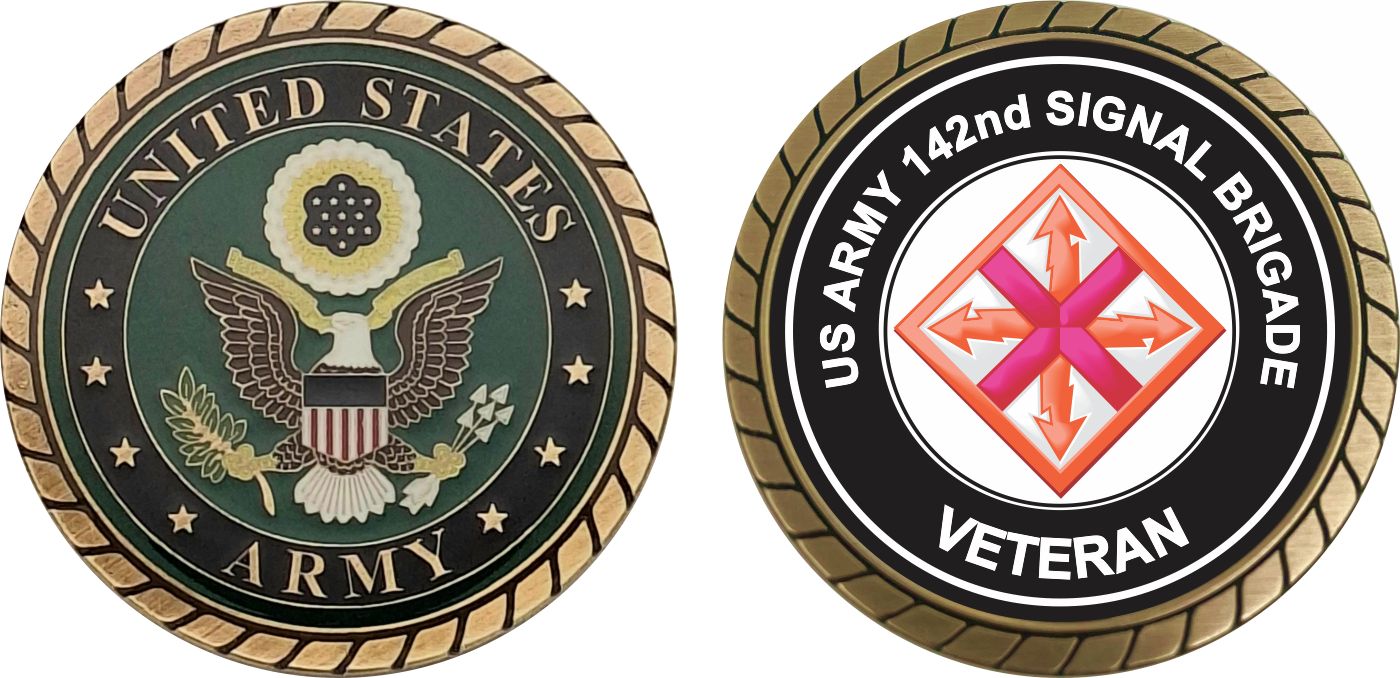 This 1 3/4” U.S. Army 142nd Signal Brigade Veteran Challenge Coin is proudly offered by MilitaryBest. This Officially Licensed Army coin has beautiful enamel finish on one side and an organized crisp clean U.S. Army 142nd Signal Brigade Veteran design on the opposite side.