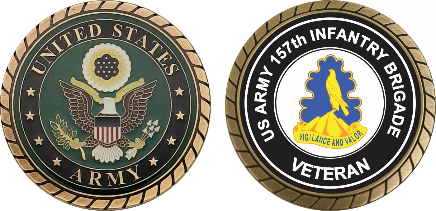 This 1 3/4” U.S. Army 157th Infantry Brigade Unit Crest Veteran Challenge Coin is proudly offered by MilitaryBest. This Officially Licensed Army coin has beautiful enamel finish on one side and an organized crisp clean U.S. Army 157th Infantry Brigade Unit Crest Veteran design on the opposite side.