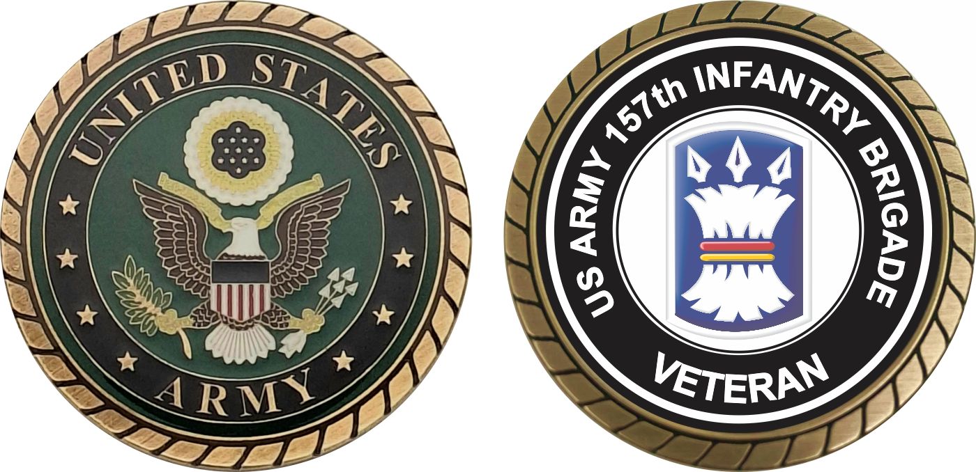 This 1 3/4” U.S. Army 157th Infantry Brigade Veteran Challenge Coin is proudly offered by MilitaryBest. This Officially Licensed Army coin has beautiful enamel finish on one side and an organized crisp clean U.S. Army 157th Infantry Brigade Veteran design on the opposite side.