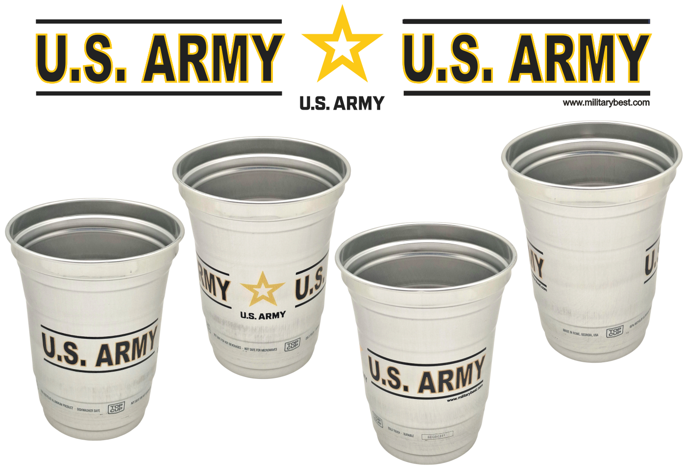 We are proud to offer this pack of four quality U.S. Army Stadium Cups. These cups hold up to 16 ounces, and measure 4 3/4" tall. These cups are durable and lightweight; they are made of an aluminum material that chills drinks quickly and keeps them cool.