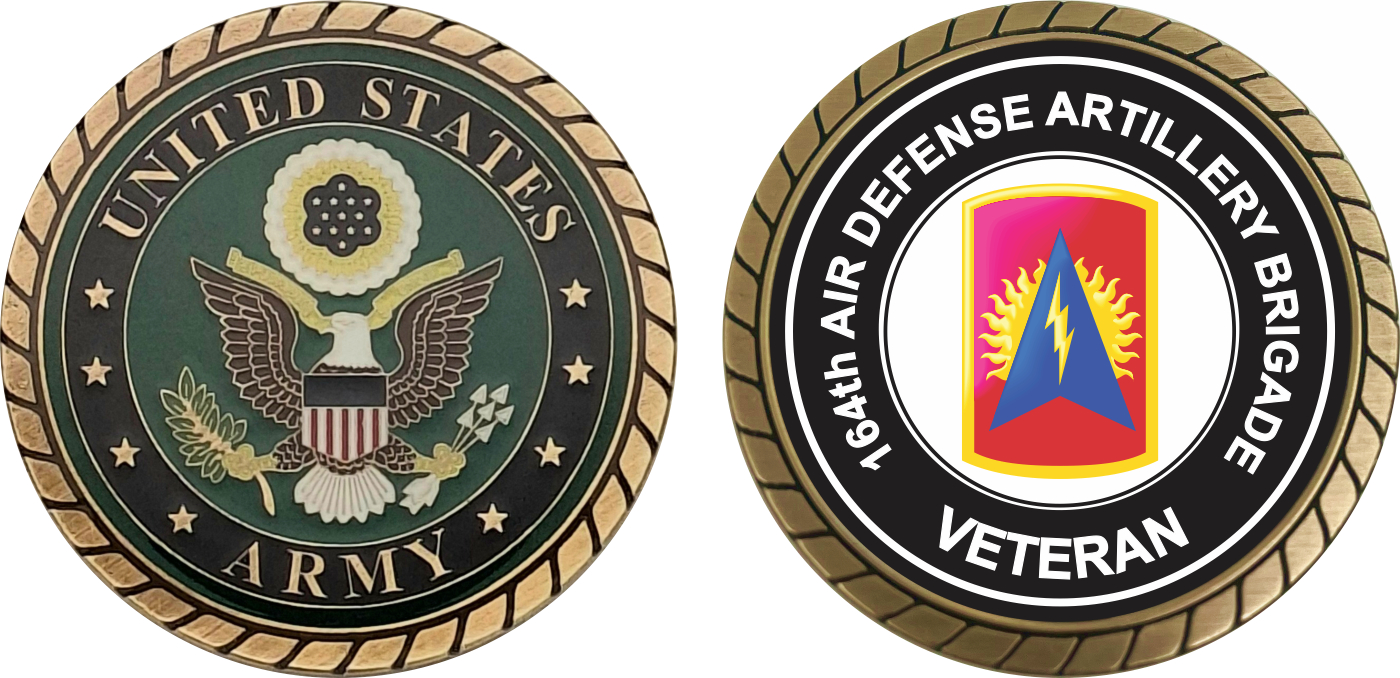 This 1 3/4” U.S. Army 164th Air Defense Artillery Brigade Veteran Challenge Coin is proudly offered by MilitaryBest. This Officially Licensed Army coin has beautiful enamel finish on one side and an organized crisp clean U.S. Army 164th Air Defense Artillery Brigade Veteran design on the opposite side.