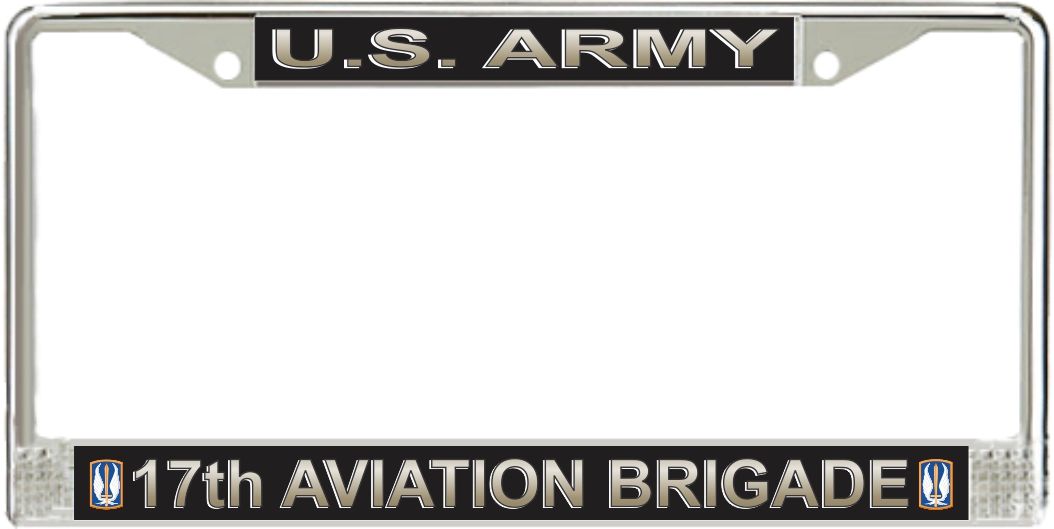 U.S. Army 17th Aviation Brigade License Plate FrameThis U.S. Army 17th Aviation Brigade License Plate Frame is made from the highest quality finished metal alloy. Each one is designed to provide years of use. Each is designed and produced in our facility in Scottsboro, Alabama.