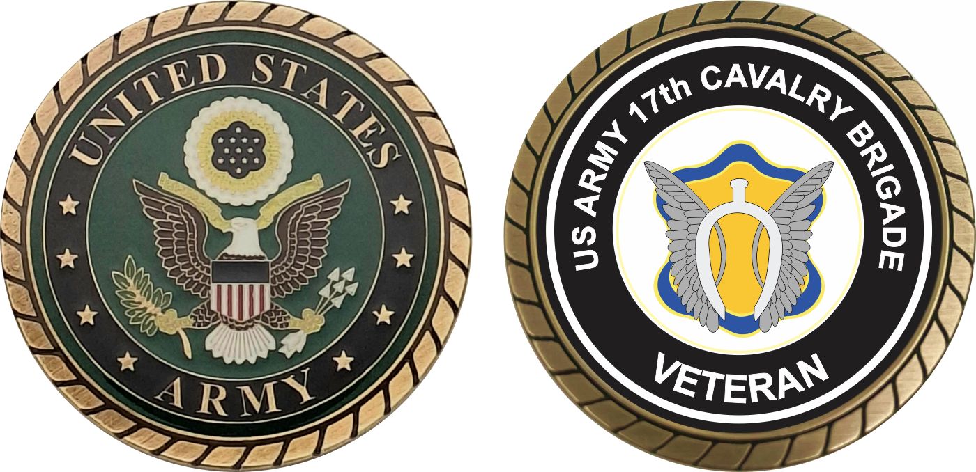 This 1 3/4” U.S. Army 17th Cavalry Brigade Veteran Challenge Coin is proudly offered by MilitaryBest. This Officially Licensed Army coin has beautiful enamel finish on one side and an organized crisp clean U.S. Army 17th Cavalry Brigade Veteran design on the opposite side.