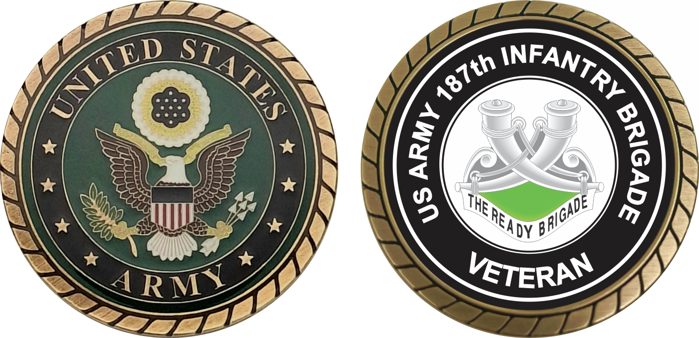 This 1 3/4” U.S. Army 187th Infantry Brigade Unit Crest Veteran Challenge Coin is proudly offered by MilitaryBest. This Officially Licensed Army coin has beautiful enamel finish on one side and an organized crisp clean U.S. Army 187th Infantry Brigade Unit Crest Veteran design on the opposite side.