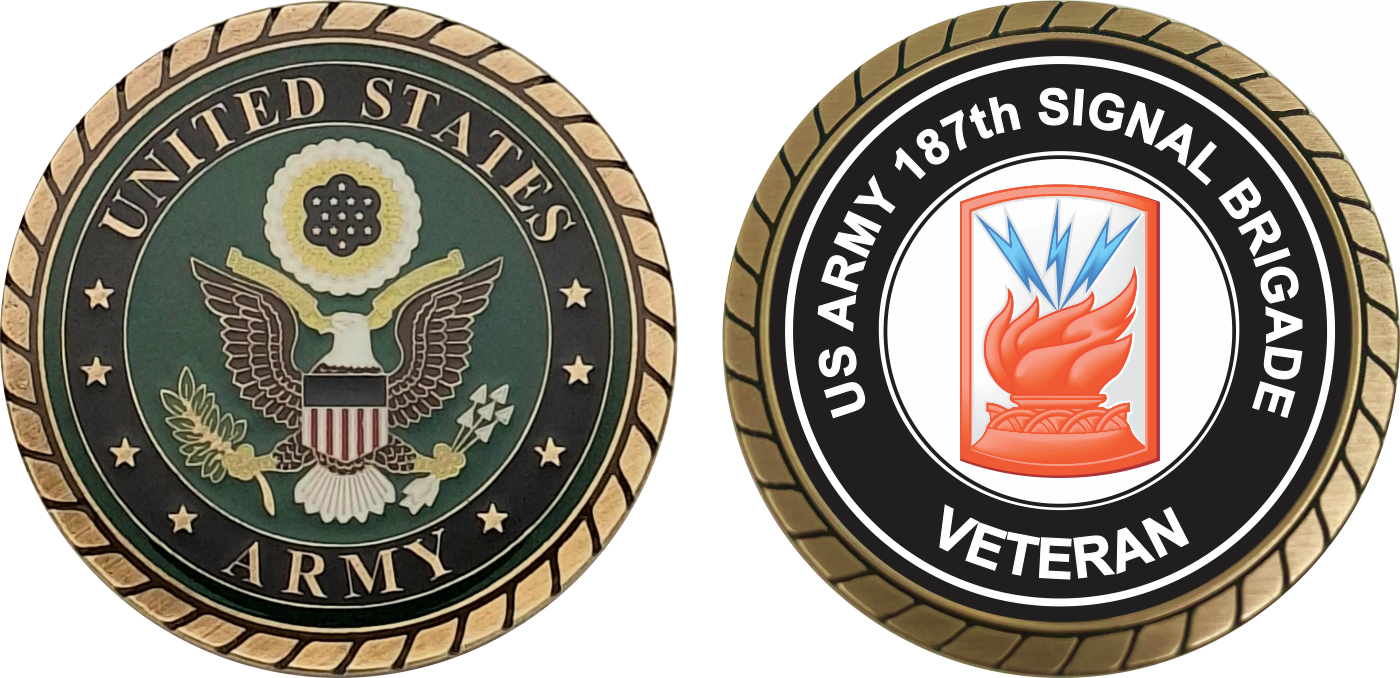 This 1 3/4” U.S. Army 187th Signal Brigade Veteran Challenge Coin is proudly offered by MilitaryBest. This Officially Licensed Army coin has beautiful enamel finish on one side and an organized crisp clean U.S. Army 187th Signal Brigade Veteran design on the opposite side.