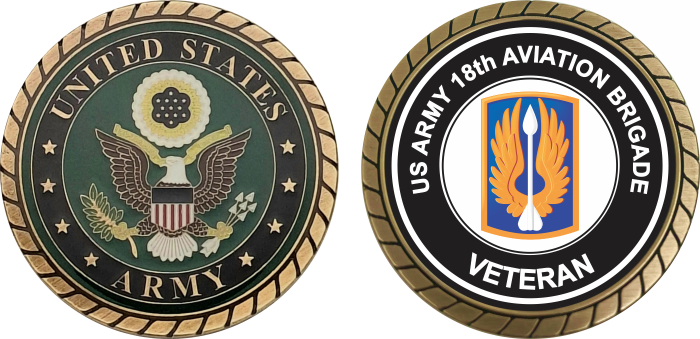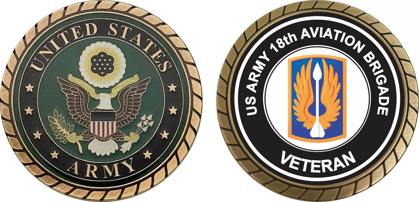 This 1 3/4” U.S. Army 18th Aviation Brigade Veteran Challenge Coin is proudly offered by MilitaryBest. This Officially Licensed Army coin has beautiful enamel finish on one side and an organized crisp clean U.S. Army 18th Aviation Brigade Veteran design on the opposite side.