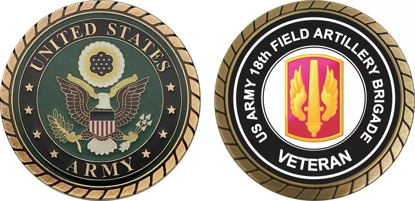 This 1 3/4” U.S. Army 18th Field Artillery Brigade Veteran Challenge Coin is proudly offered by MilitaryBest. This Officially Licensed Army coin has beautiful enamel finish on one side and an organized crisp clean U.S. Army 18th Field Artillery Brigade Veteran design on the opposite side.