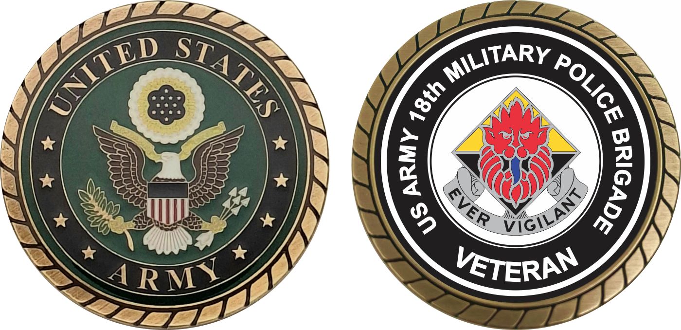 This 1 3/4” U.S. Army 18th Military Police Brigade Veteran Challenge Coin is proudly offered by MilitaryBest. This Officially Licensed Army coin has beautiful enamel finish on one side and an organized crisp clean U.S. Army 18th Military Police Brigade Veteran design on the opposite side.