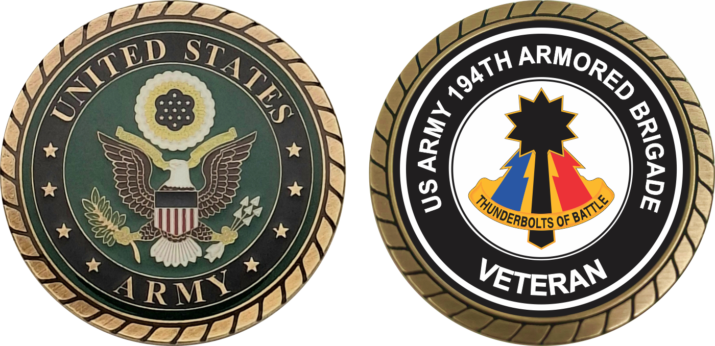 This 1 3/4” U.S. Army 194th Armored Brigade Unit Crest Veteran Challenge Coin is proudly offered by MilitaryBest. This Officially Licensed Army coin has beautiful enamel finish on one side and an organized crisp clean U.S. Army 194th Armored Brigade Unit Crest Veteran design on the opposite side.
