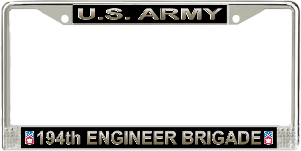 U.S. Army 194th Engineer Brigade License Plate FrameThis U.S. Army 194th Engineer Brigade License Plate Frame is made from the highest quality finished metal alloy. Each one is designed to provide years of use. Each is designed and produced in our facility in Scottsboro, Alabama.