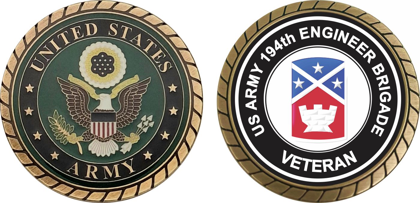 This 1 3/4” U.S. Army 194th Engineer Brigade Veteran Challenge Coin is proudly offered by MilitaryBest. This Officially Licensed Army coin has beautiful enamel finish on one side and an organized crisp clean U.S. Army 194th Engineer Brigade Veteran design on the opposite side.