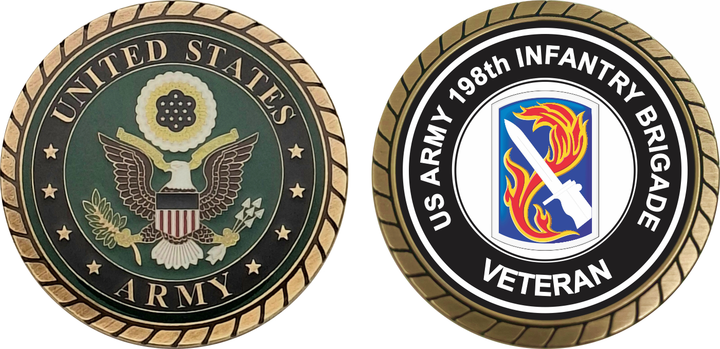 This 1 3/4” U.S. Army 198th Infantry Brigade Veteran Challenge Coin is proudly offered by MilitaryBest. This Officially Licensed Army coin has beautiful enamel finish on one side and an organized crisp clean U.S. Army 198th Infantry Brigade Veteran design on the opposite side.