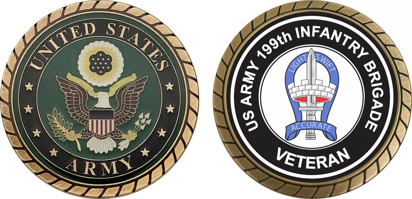 This 1 3/4” U.S. Army 199th Infantry Brigade Veteran Challenge Coin is proudly offered by MilitaryBest. This Officially Licensed Army coin has beautiful enamel finish on one side and an organized crisp clean U.S. Army 199th Infantry Brigade Veteran design on the opposite side.