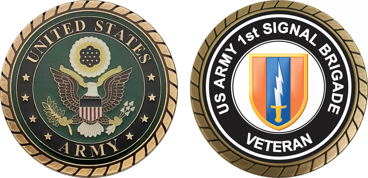 This 1 3/4” U.S. Army 1st Signal Brigade Veteran Challenge Coin is proudly offered by MilitaryBest. This Officially Licensed Army coin has beautiful enamel finish on one side and an organized crisp clean U.S. Army 1st Signal Brigade Veteran design on the opposite side.