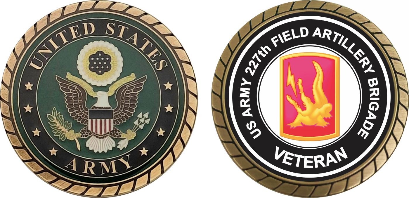 This 1 3/4” U.S. Army 227th Field Artillery Brigade Veteran Challenge Coin is proudly offered by MilitaryBest. This Officially Licensed Army coin has beautiful enamel finish on one side and an organized crisp clean U.S. Army 227th Field Artillery Brigade Veteran design on the opposite side.