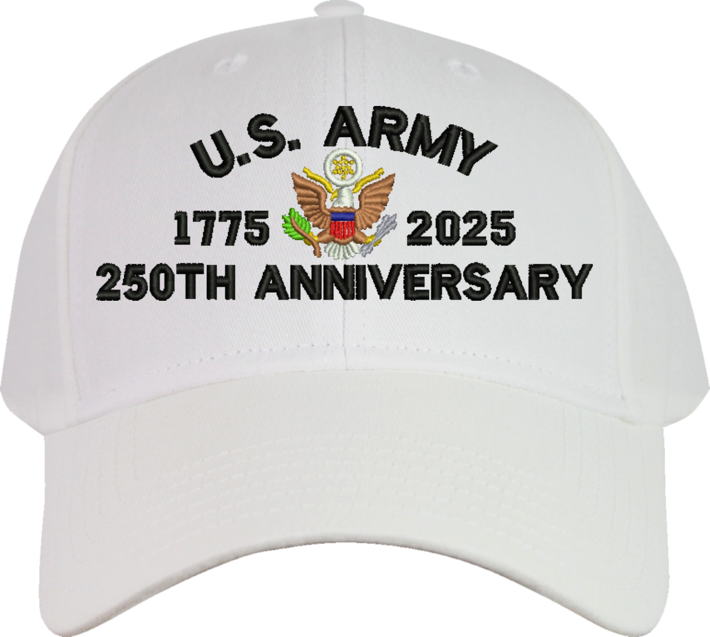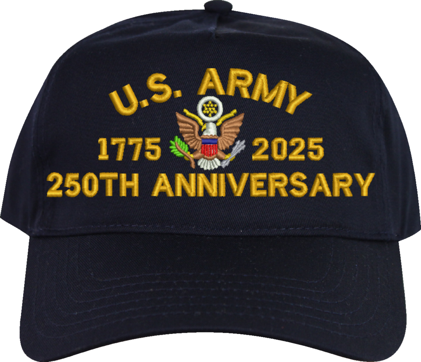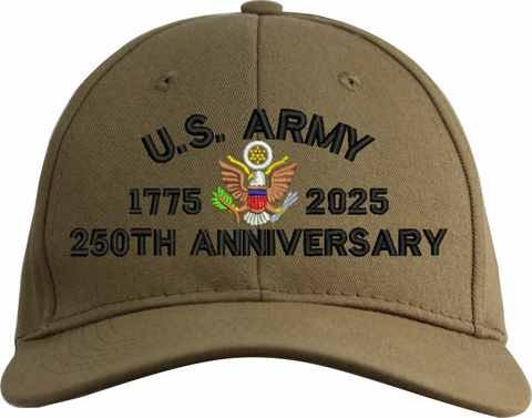 MilitaryBest is proud to offer this quality U.S. Army 250th Anniversary Cap. This cap is available in either 5 panel high profile or 6 panel low profile styling. This cap will make a great addition to your collection or a great gift. This cap is crafted by our skilled embroidery technicians at our facilities in Scottsboro, AL. Your satisfaction is guaranteed!For caps ordered with custom embroidered personalized text please allow an additional 3 to 5 days production time. All custom text will be embroidered in ALL CAPS. Caps with custom text or eggs are non-returnable unless there is a material defect in the cap.