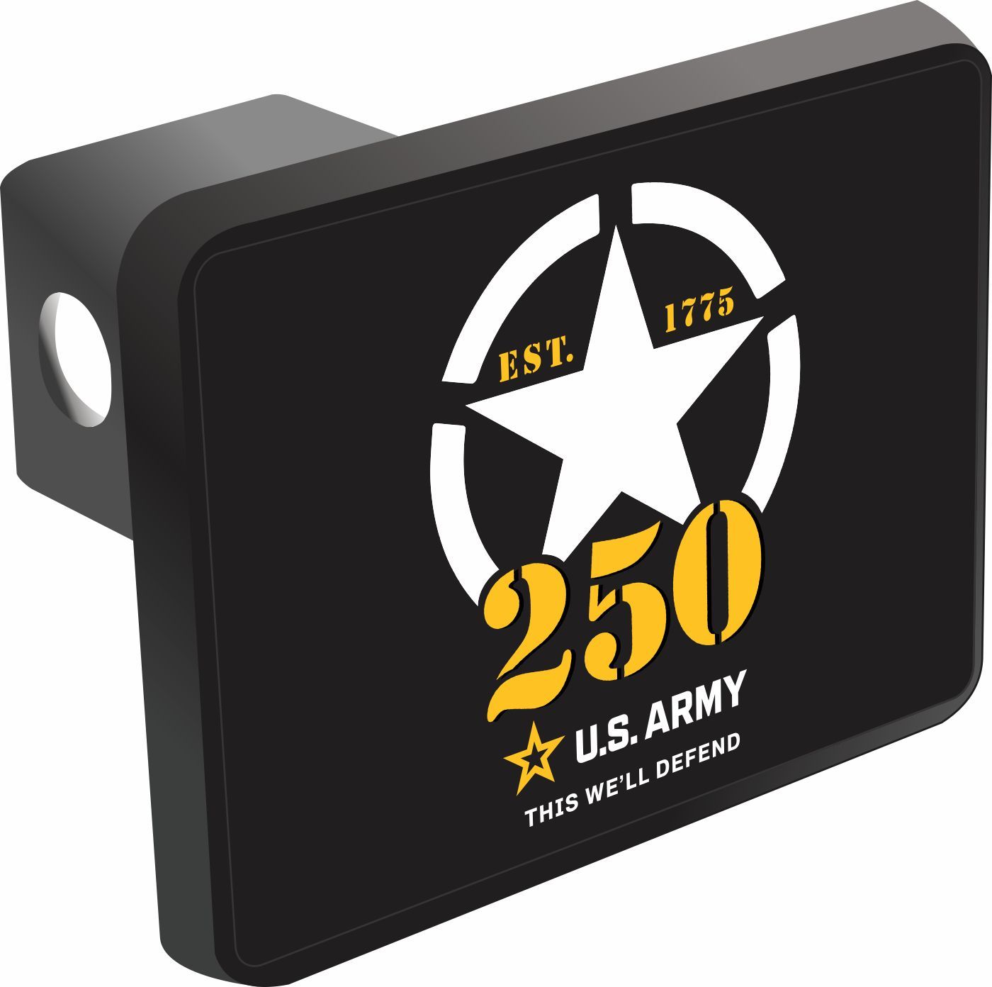 U.S. Army 250th Anniversary Hitch CoverThis U.S. Army 250th Anniversary Hitch Cover is proudly Made in the USA. Each Hitch Cover's face plate measures 4.7" x 3.4" and is applied on a black heavy duty injection molded plastic 2" hitch cover; link pin not included. The face plate of the hitch cover is sublimation printed to provide a beautiful glossy finish sure to catch the eye. This hitch cover would make a wonderful addition to your truck or other vehicle.