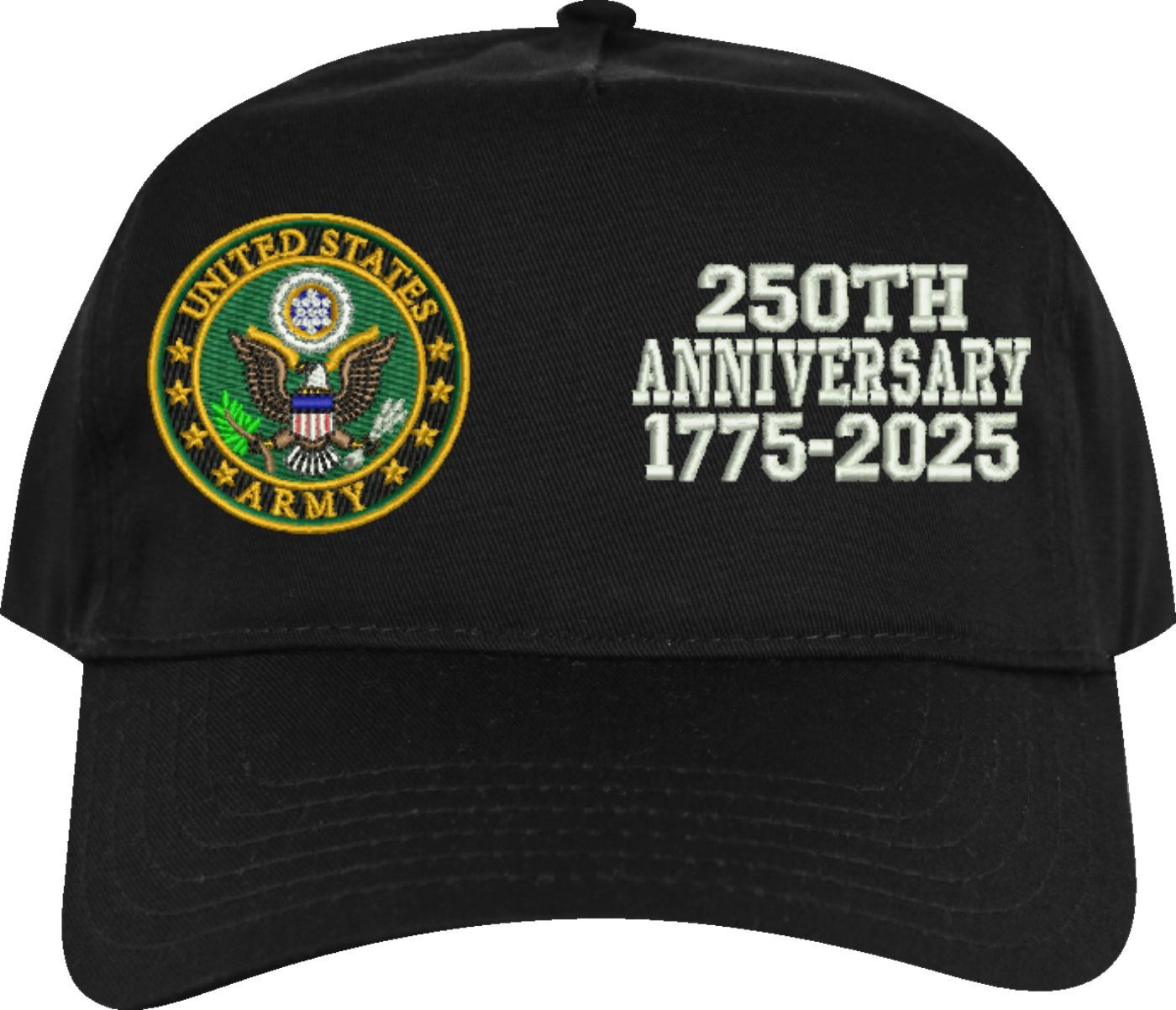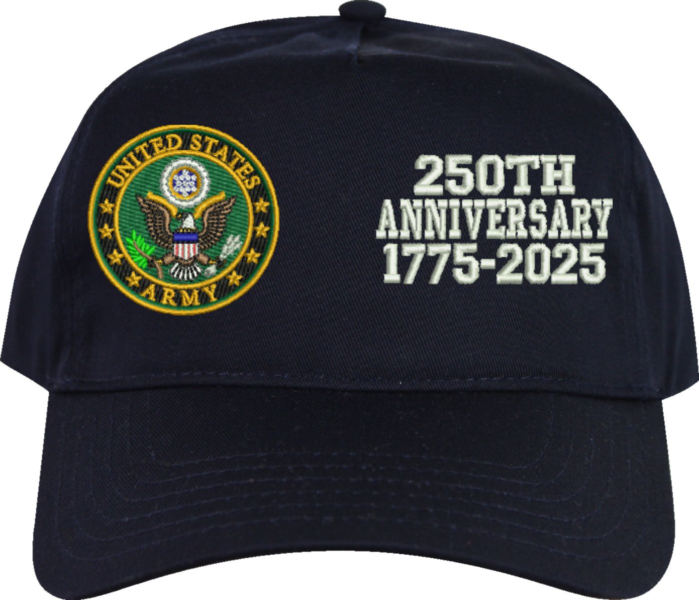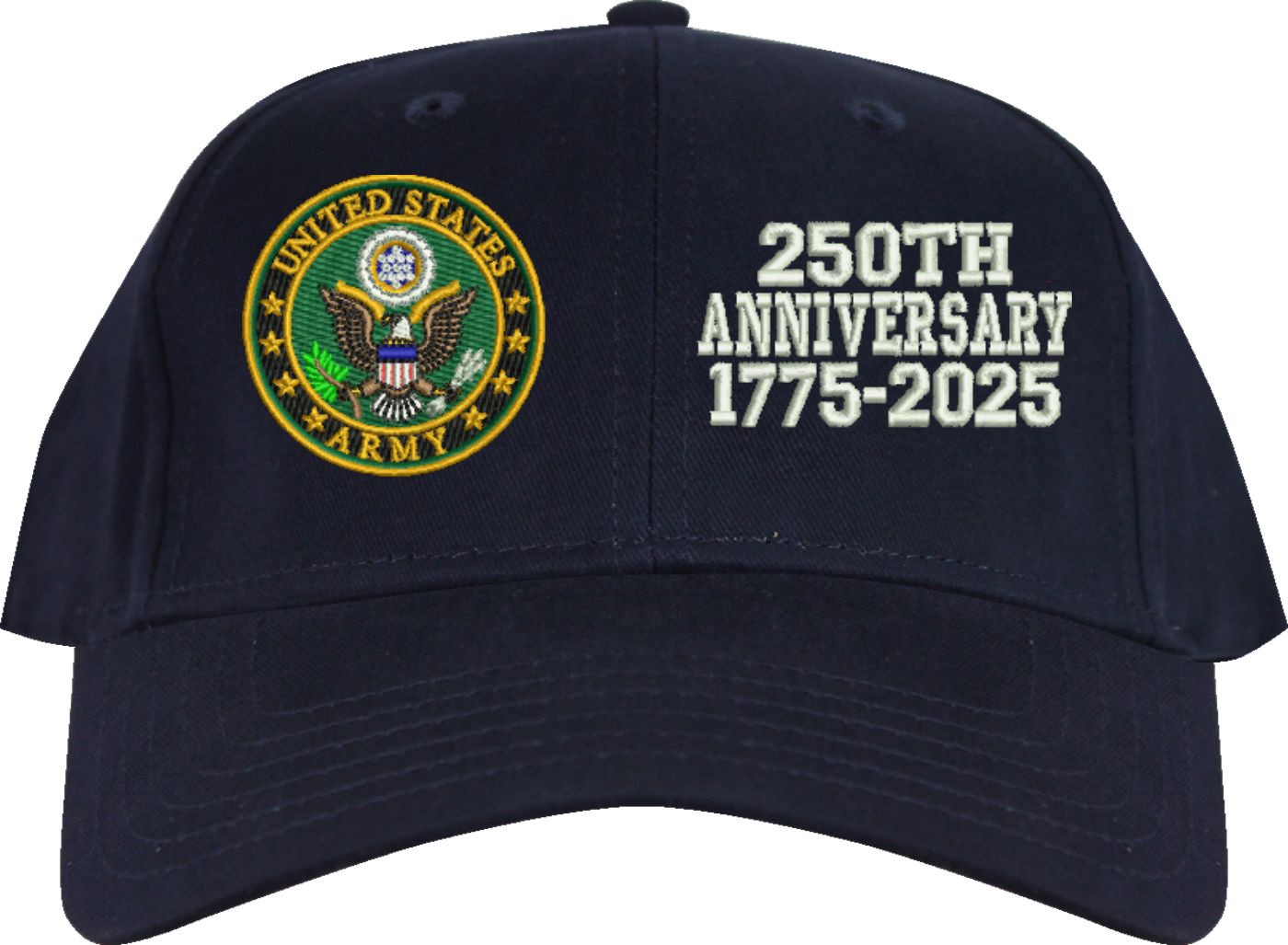 MilitaryBest is proud to offer this quality U.S. Army 250th Anniversary Split Design Embroidered Cap. This cap is available in either 5 panel high profile or 6 panel low profile styling. This cap will make a great addition to your collection or a great gift. This cap is crafted by our skilled embroidery technicians at our facilities in Scottsboro, AL. Your satisfaction is guaranteed!For caps ordered with custom embroidered personalized text please allow an additional 3 to 5 days production time. All custom text will be embroidered in ALL CAPS. Caps with custom text or eggs are non-returnable unless there is a material defect in the cap.