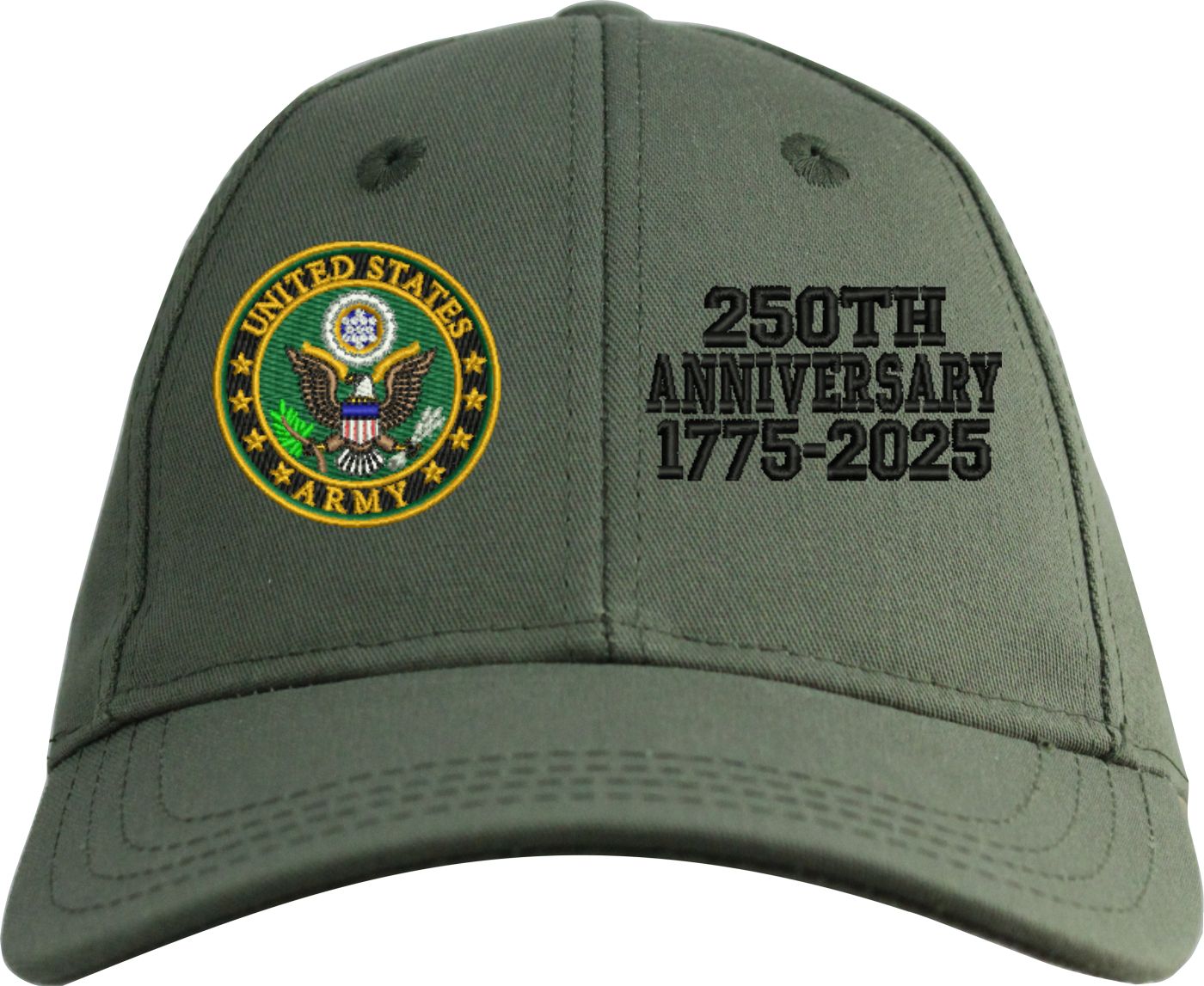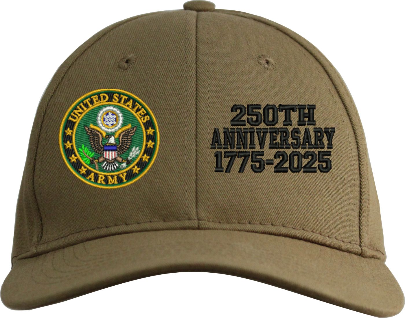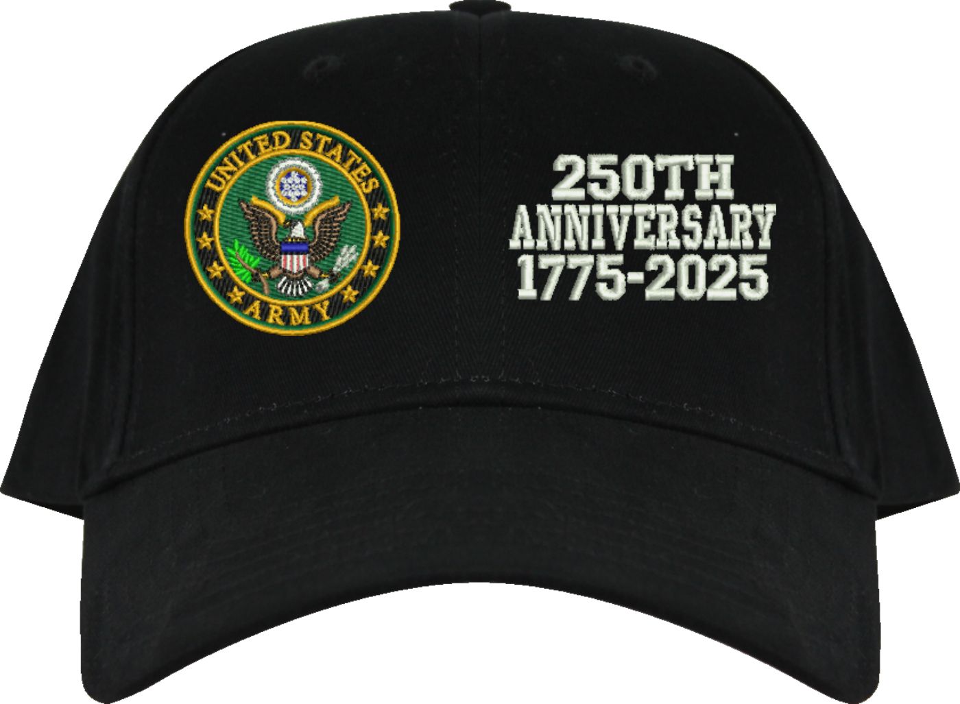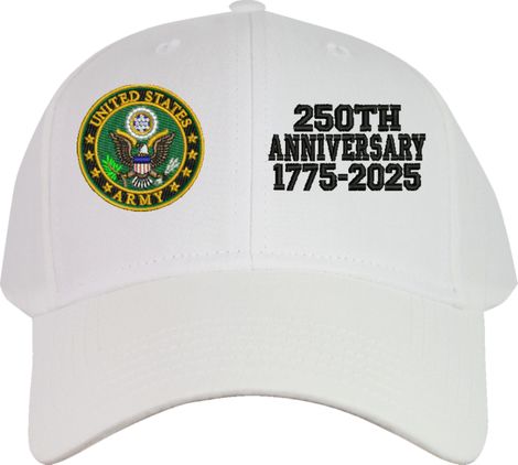 MilitaryBest is proud to offer this quality U.S. Army 250th Anniversary Split Design Embroidered Cap. This cap is available in either 5 panel high profile or 6 panel low profile styling. This cap will make a great addition to your collection or a great gift. This cap is crafted by our skilled embroidery technicians at our facilities in Scottsboro, AL. Your satisfaction is guaranteed!For caps ordered with custom embroidered personalized text please allow an additional 3 to 5 days production time. All custom text will be embroidered in ALL CAPS. Caps with custom text or eggs are non-returnable unless there is a material defect in the cap.