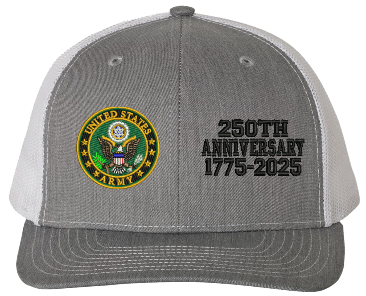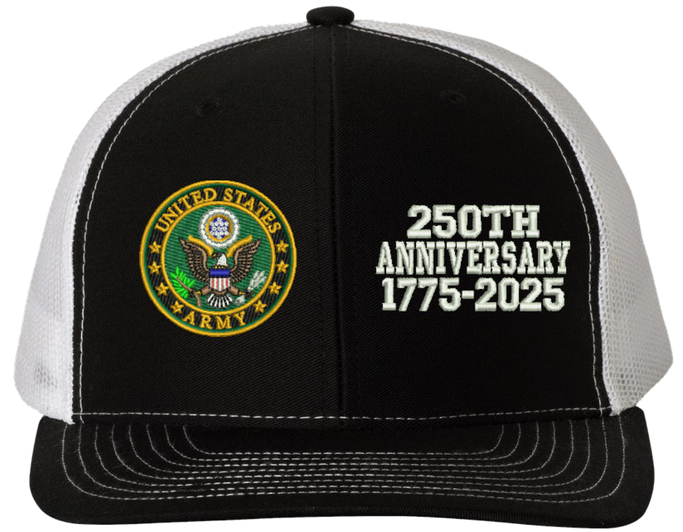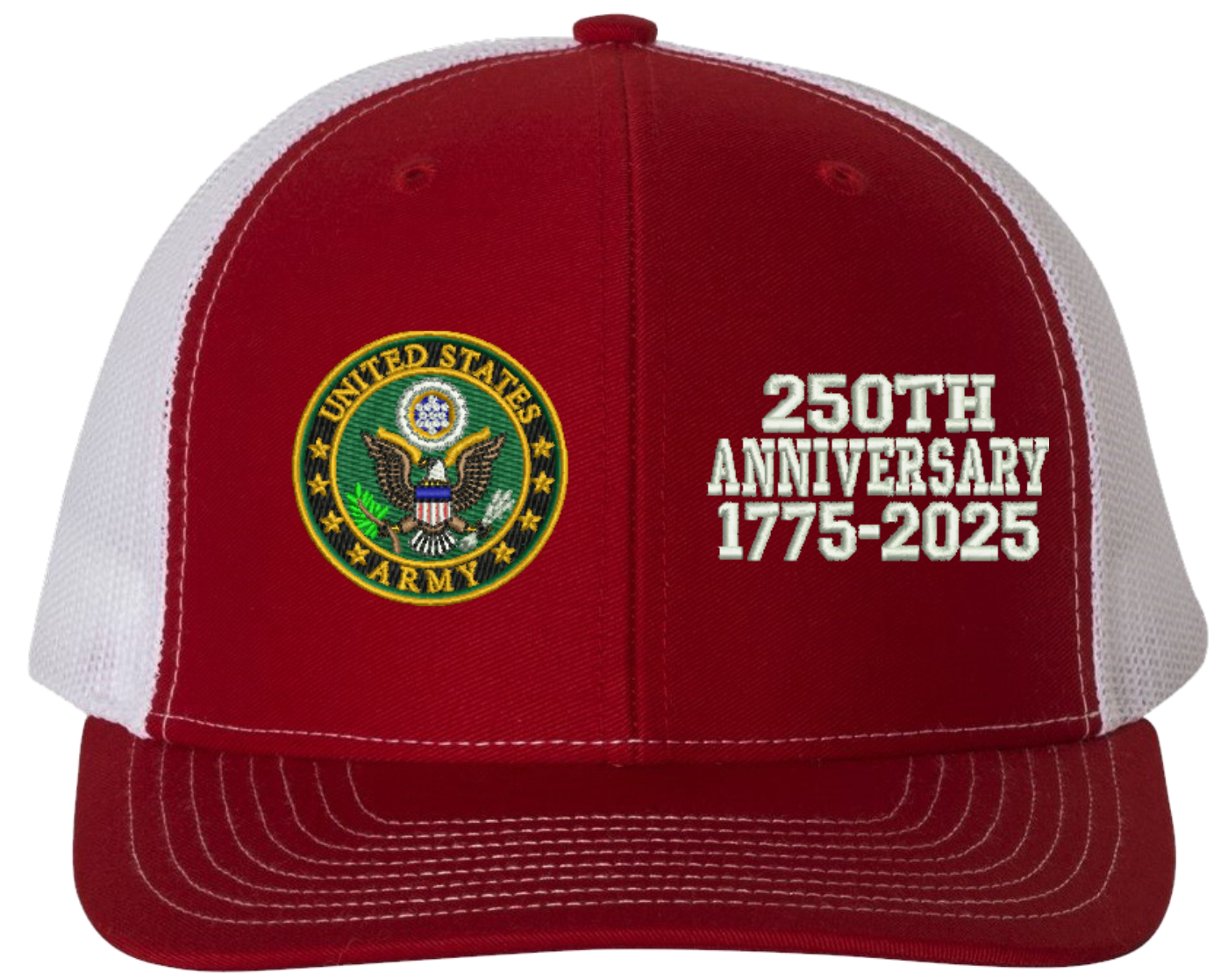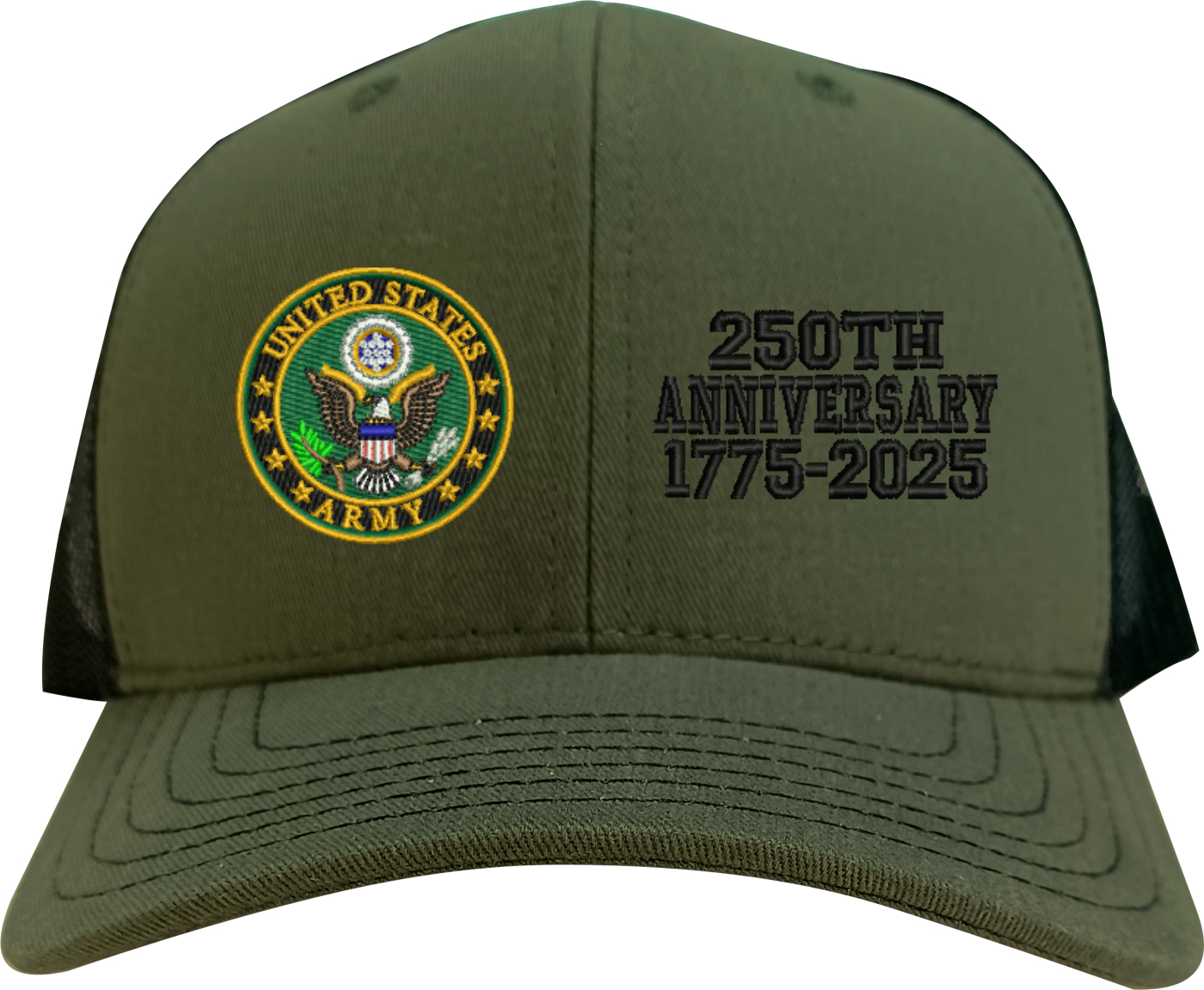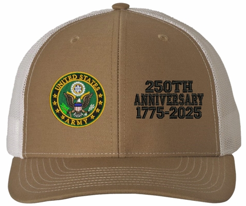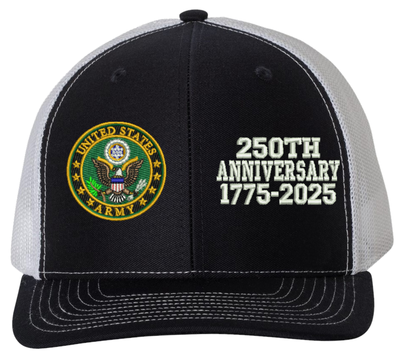 MilitaryBest is proud to offer this U.S. Army 250th Anniversary Split Design Embroidered Mesh-Back Cap. The design of this Cap has an Insignia on the Left side and Text on the Right side, creating a "split" design. This Mesh-Back Cap is expertly crafted by our skilled embroidery technicians at our facilities in Scottsboro, Alabama. As with all MilitaryBest items, your satisfaction is guaranteed!For caps ordered with custom embroidered personalized text please allow an additional 3 to 5 days production time. All custom back text will be embroidered in ALL CAPITAL LETTERS. Caps with back text or eggs are non-returnable unless there is a material defect in the cap.