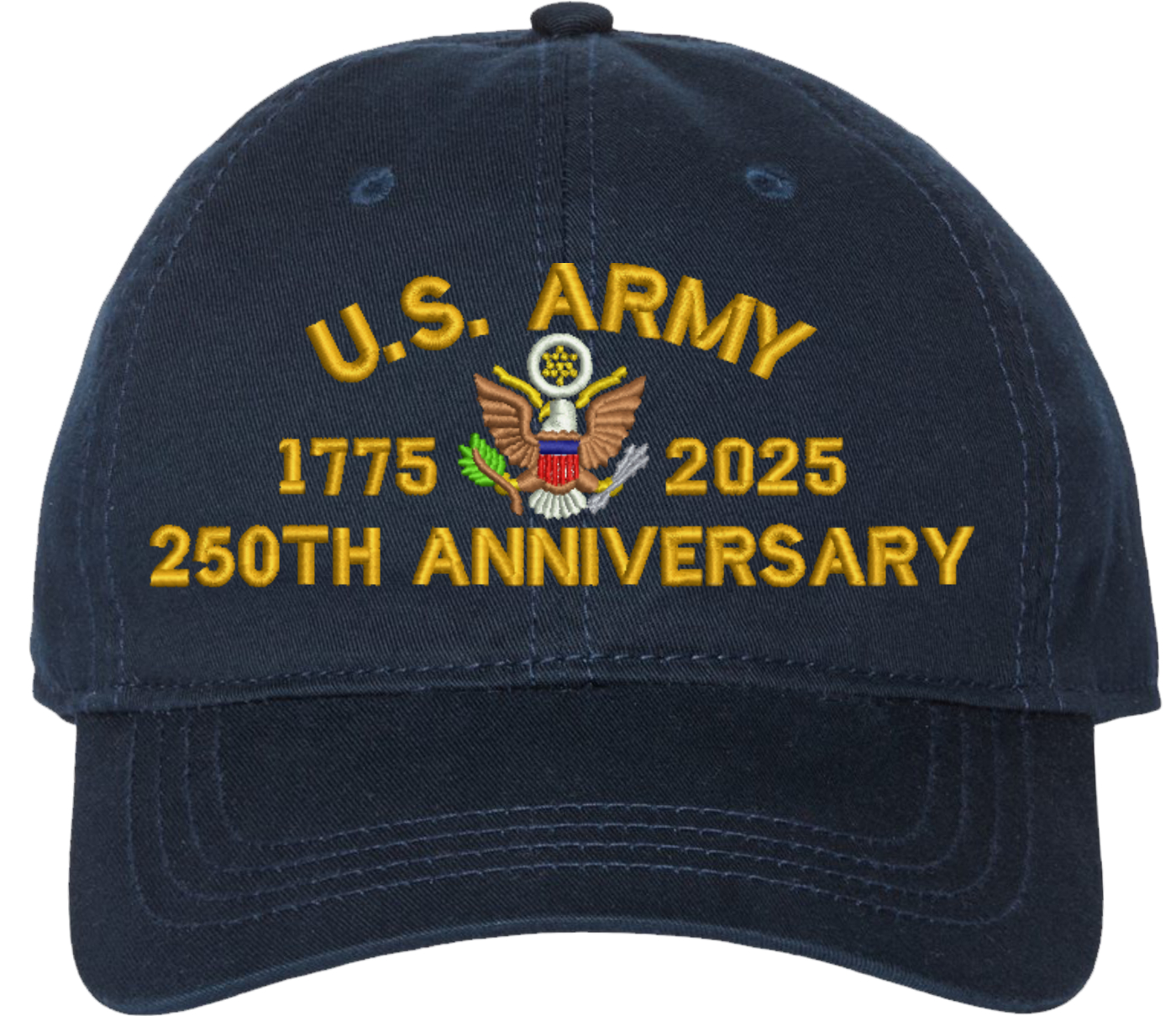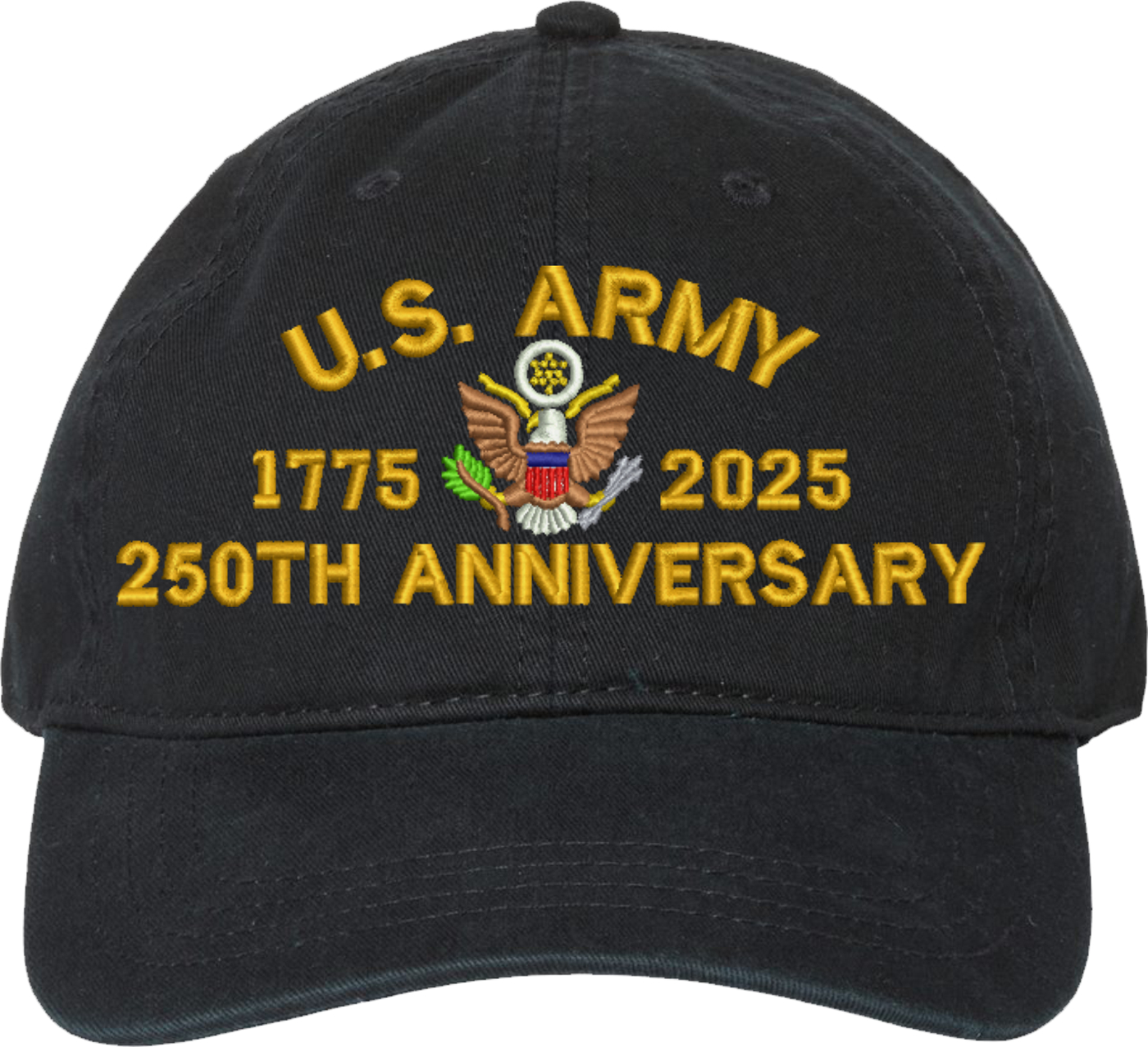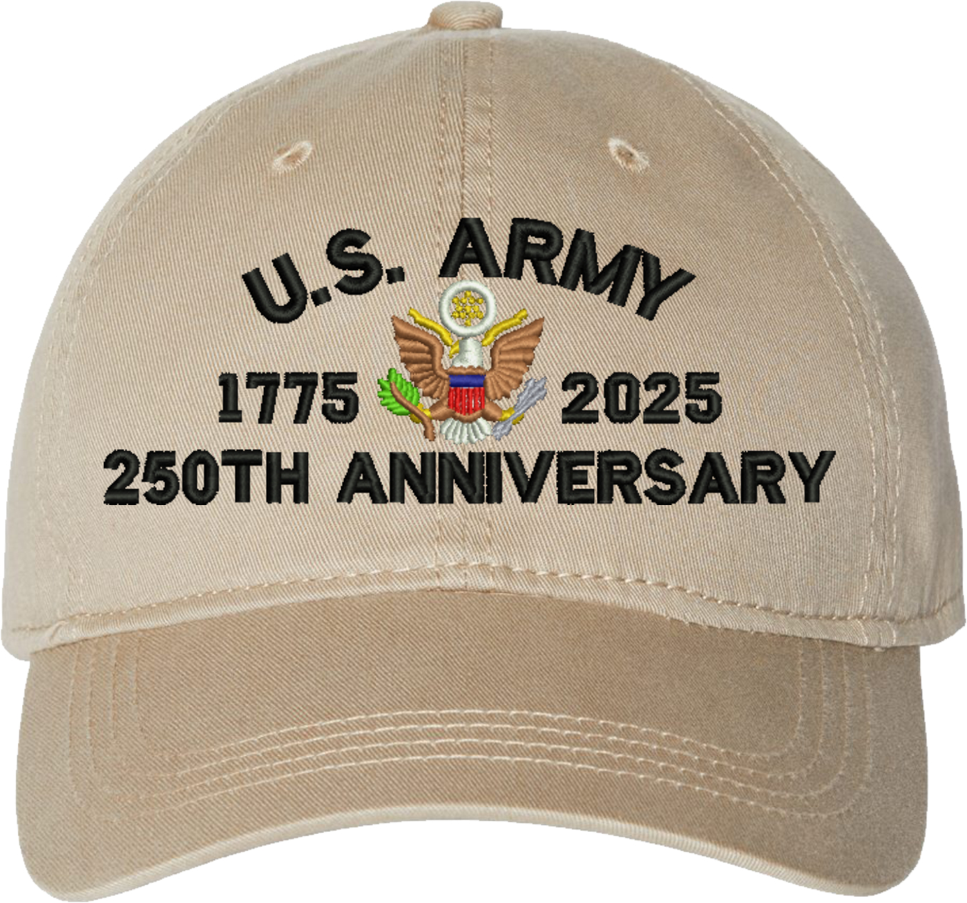 Show your Army pride with this U.S. Army 250th Anniversary Unstructured Dad Cap from MilitaryBest. Crafted from 100% washed chino twill cotton, this six-panel, low-profile cap offers a relaxed and comfortable fit. Featuring high-quality embroidery done in our Scottsboro, Alabama facility, this cap is designed with a pre-curved visor and an adjustable tri-glide buckle closure for a perfect fit. Whether for everyday wear or as a meaningful gift, this cap is a great way to honor your own or a loved one's service.If a ribbon stack is chosen as the insignia, side of insignia text can not be embroidered. For caps ordered with custom embroidered personalized text please allow an additional 3 to 5 days production time. All custom back text will be embroidered in ALL CAPITAL LETTERS. Caps with back text or eggs are non-returnable unless there is a material defect in the cap.