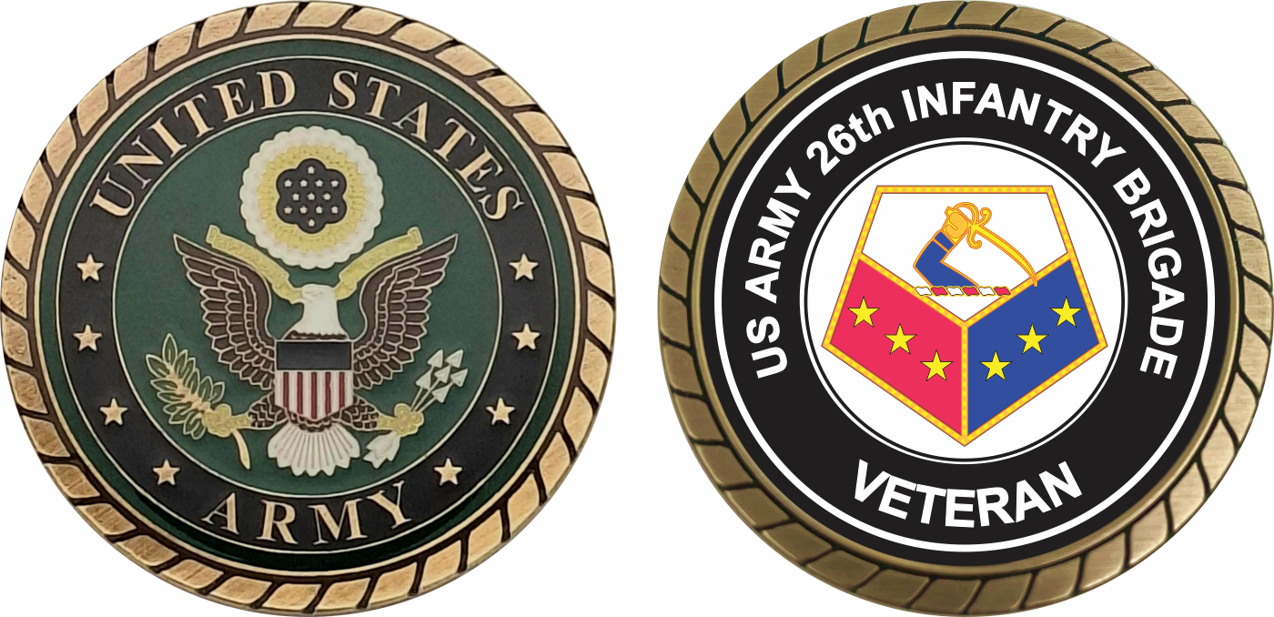 This 1 3/4” U.S. Army 26th Infantry Brigade Unit Crest Veteran Challenge Coin is proudly offered by MilitaryBest. This Officially Licensed Army coin has beautiful enamel finish on one side and an organized crisp clean U.S. Army 26th Infantry Brigade Unit Crest Veteran design on the opposite side.