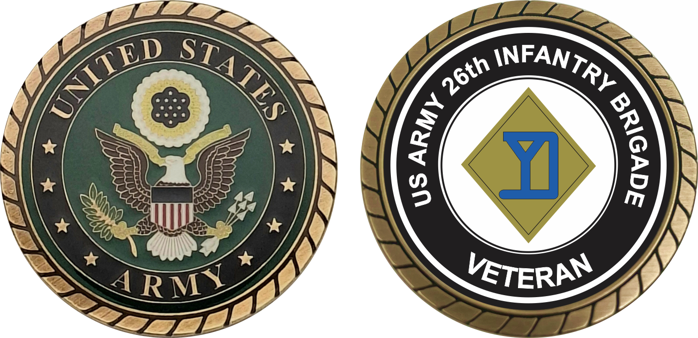 This 1 3/4” U.S. Army 26th Infantry Brigade Veteran Challenge Coin is proudly offered by MilitaryBest. This Officially Licensed Army coin has beautiful enamel finish on one side and an organized crisp clean U.S. Army 26th Infantry Brigade Veteran design on the opposite side.