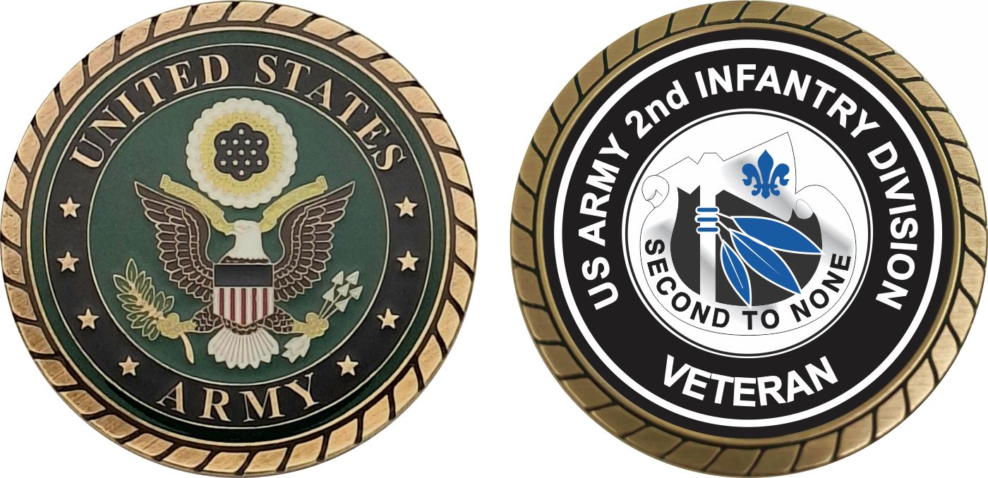 This 1 3/4” U.S. Army 2nd Infantry Divison Unit Crest Veteran Challenge Coin is proudly offered by Militarybest. This Officially Licensed Army coin has beautiful enamel finish on one side and an organized crisp clean 2nd Infantry Divison Unit Crest Veteran design on the opposite side.