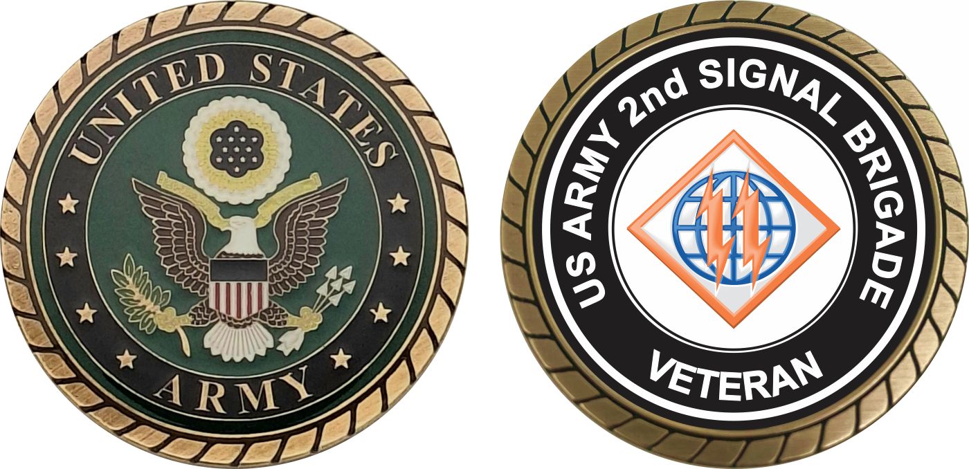 This 1 3/4” U.S. Army 2nd Signal Brigade Veteran Challenge Coin is proudly offered by MilitaryBest. This Officially Licensed Army coin has beautiful enamel finish on one side and an organized crisp clean U.S. Army 2nd Signal Brigade Veteran design on the opposite side.