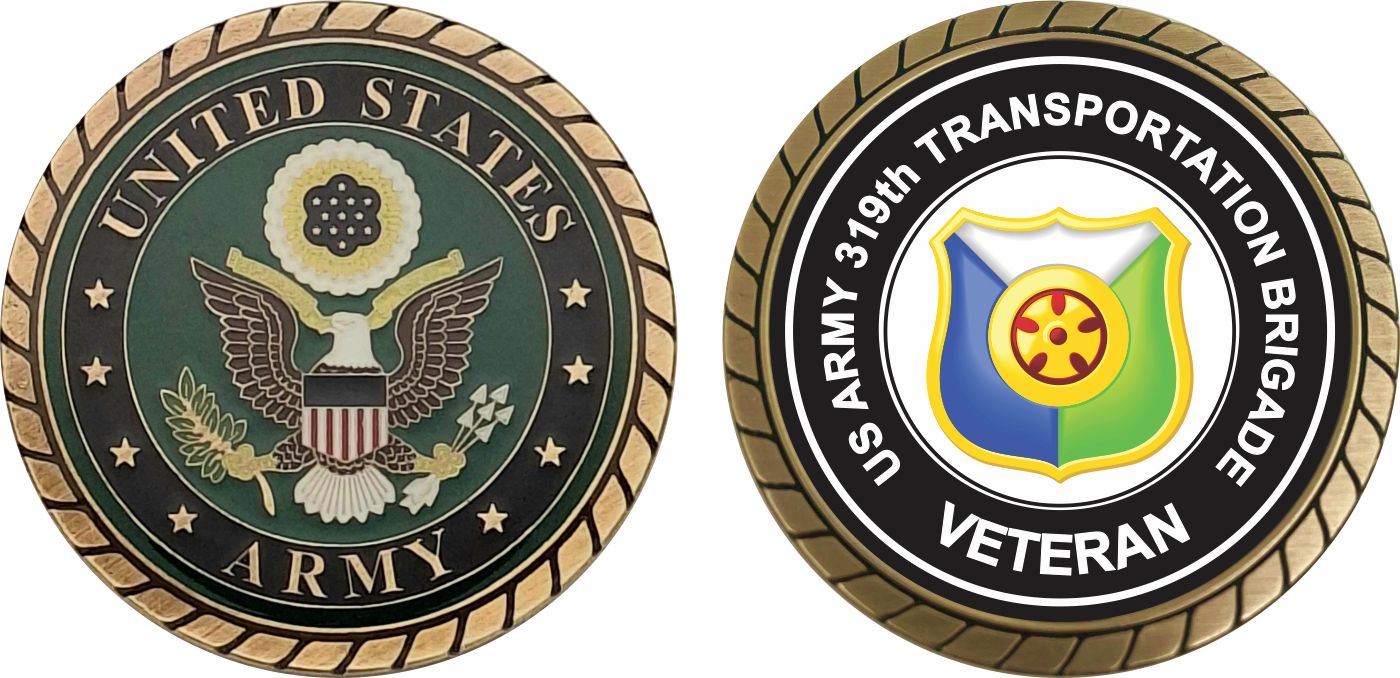 This 1 3/4” U.S. Army 319th Transportation Brigade Veteran Challenge Coin is proudly offered by MilitaryBest. This Officially Licensed Army coin has beautiful enamel finish on one side and an organized crisp clean U.S. Army 319th Transportation Brigade Veteran design on the opposite side.
