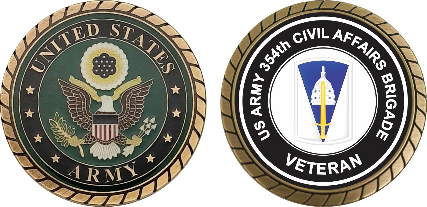This 1 3/4” U.S. Army 354th Civil Affairs Brigade Veteran Challenge Coin is proudly offered by MilitaryBest. This Officially Licensed Army coin has beautiful enamel finish on one side and an organized crisp clean U.S. Army 354th Civil Affairs Brigade Veteran design on the opposite side.