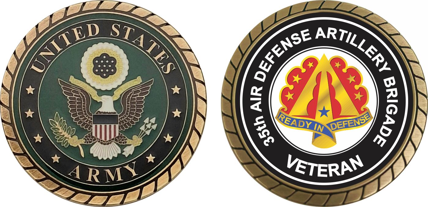 This 1 3/4” U.S. Army 35th Air Defense Artillery Brigade Unit Crest Veteran Challenge Coin is proudly offered by MilitaryBest. This Officially Licensed Army coin has beautiful enamel finish on one side and an organized crisp clean U.S. Army 35th Air Defense Artillery Brigade Unit Crest Veteran design on the opposite side.