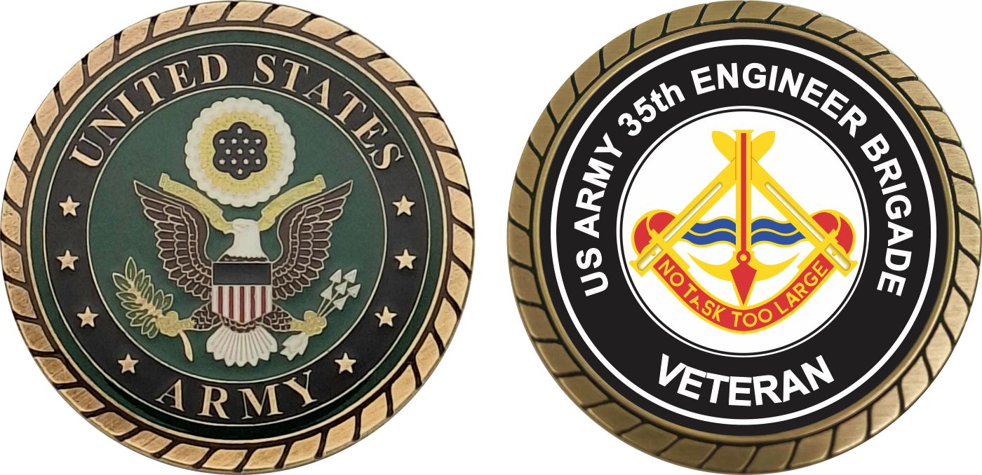 This 1 3/4” U.S. Army 35th Engineer Brigade Unit Crest Veteran Challenge Coin is proudly offered by MilitaryBest. This Officially Licensed Army coin has beautiful enamel finish on one side and an organized crisp clean U.S. Army 35th Engineer Brigade Unit Crest Veteran design on the opposite side.