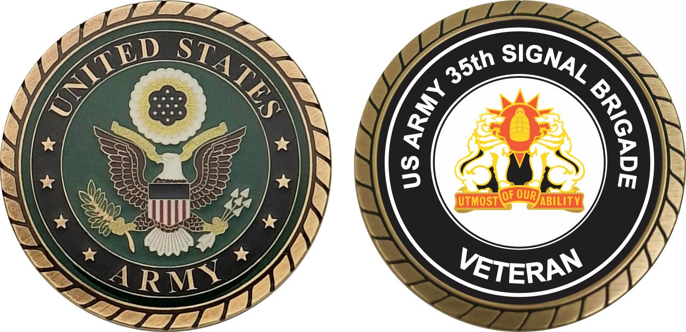 This 1 3/4” U.S. Army 35th Signal Brigade Unit Crest Veteran Challenge Coin is proudly offered by MilitaryBest. This Officially Licensed Army coin has beautiful enamel finish on one side and an organized crisp clean U.S. Army 35th Signal Brigade Unit Crest Veteran design on the opposite side.